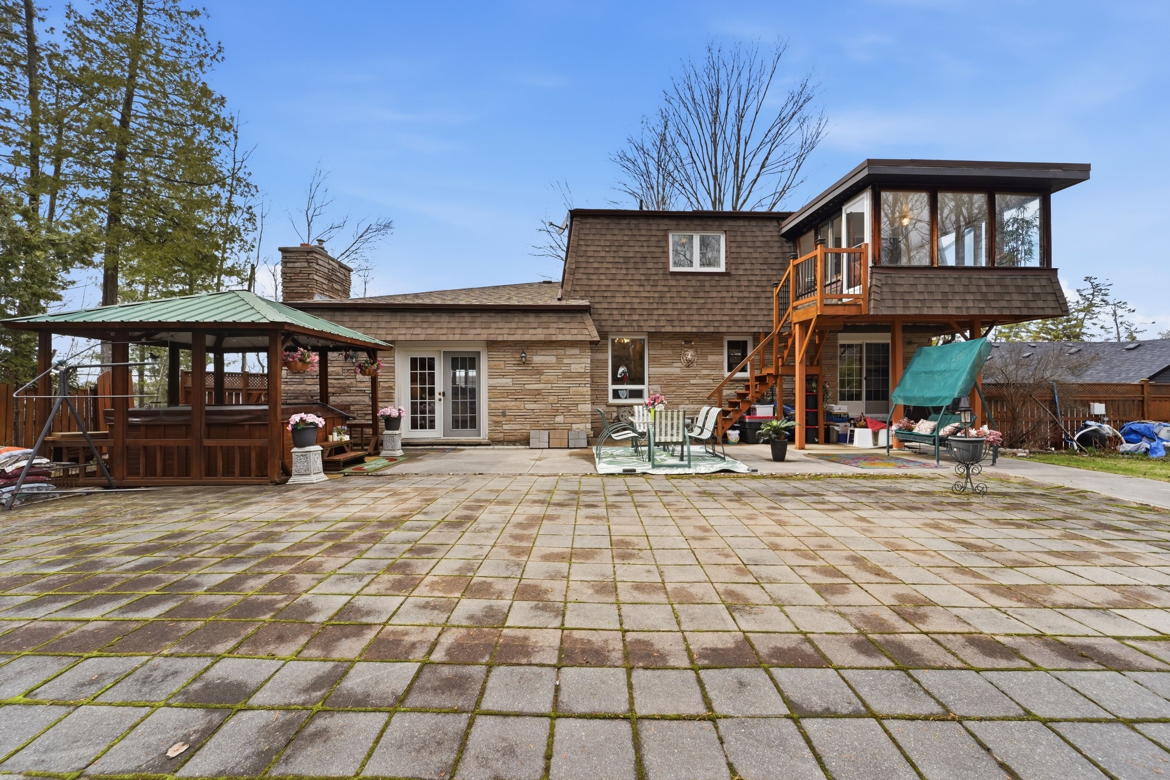 Welcome to spectacular 645 Hatton Avenue a one of a kind home where there is plenty of room inside & out for everyone who enjoys entertaining, wide open spaces, lake views and recreation. Vacant lot next door adds to privacy with trees in the back. Landscaped with perennial gardens& a creek fed hose for endless water supply to keep them green all summer. Large front porch for taking in the view of Chemong Lake across the street. Everyone is amazed with the original layout & space on every floor 2,600+ sq ft is finished. Main floor has a living room, dining room, galley kitchen, breakfast nook, den with wall to wall gas fireplace (currently used as a showstopper additional dining area) and family room with bar with built in fridge and extra wide sliding door to the covered side deck overlooking the lake. A French door opens from den to backyard & hot tub under a gazebo while another sliding door from dining area opens to aboveground pool area. The custom kitchen has wall oven and countertop range set into large quartz countertop. All appliances included. This lot is big with a huge backyard with pond & water feature & creek running through. On the second floor are 3 spacious bedrooms with large windows & the primary bedroom with walk in closet & 2 pc ensuite with sliding doors to an insulated sunroom that has a walkout the backyard. Basement has an in law suite including bathroom with double vanity, walk in shower, loads of storage space and large kitchen. Suitable for multiple family/multigenerational living. There is storage area at the back of the garage that has power that would be suitable for a shop. The home is wired for and includes a portable generator. Great potential for Airbnb. Close to shopping & dining in Bridge north & Peterborough. Close to parks, beaches, boat launch, fishing & year round recreation. High speed fibre optic internet keeps you connected. Come on over, sit a while and relax. Remember, if you love it, you better put an offer on it!!