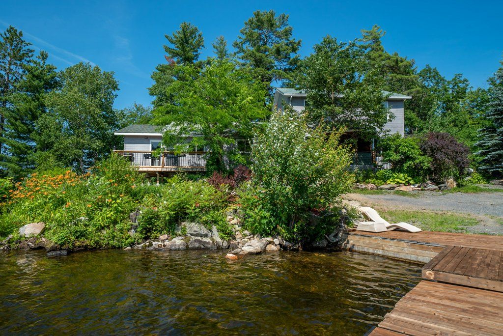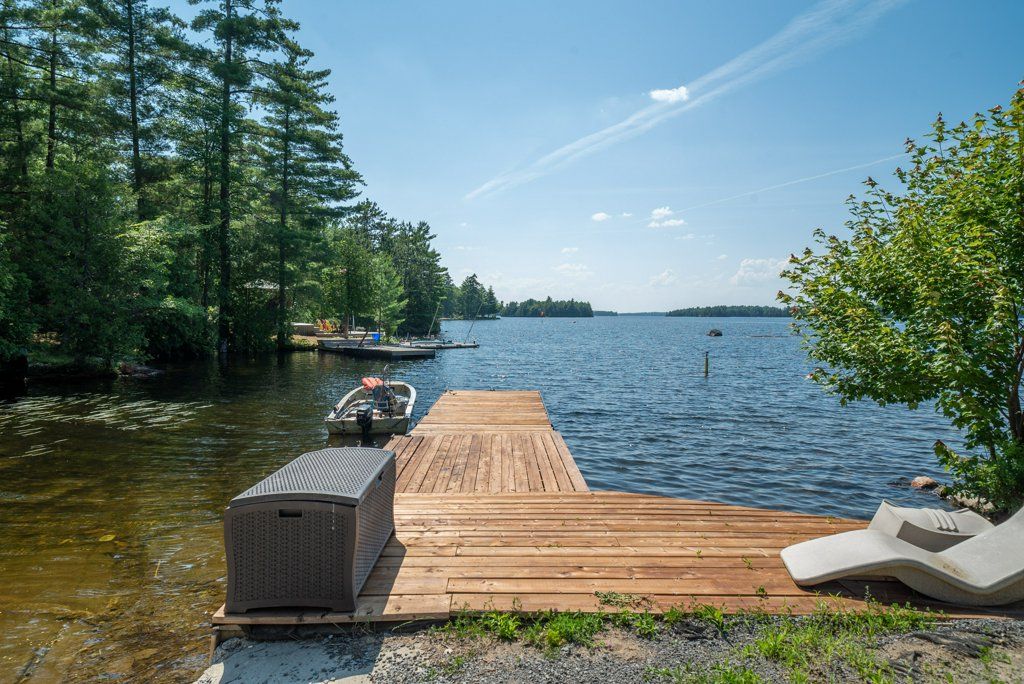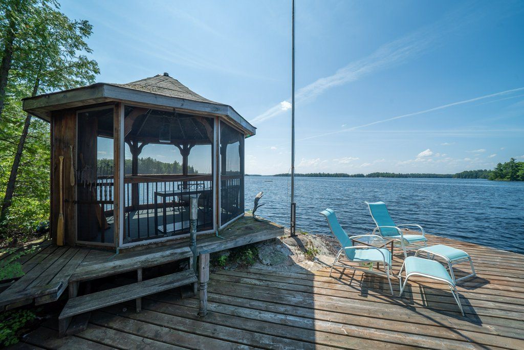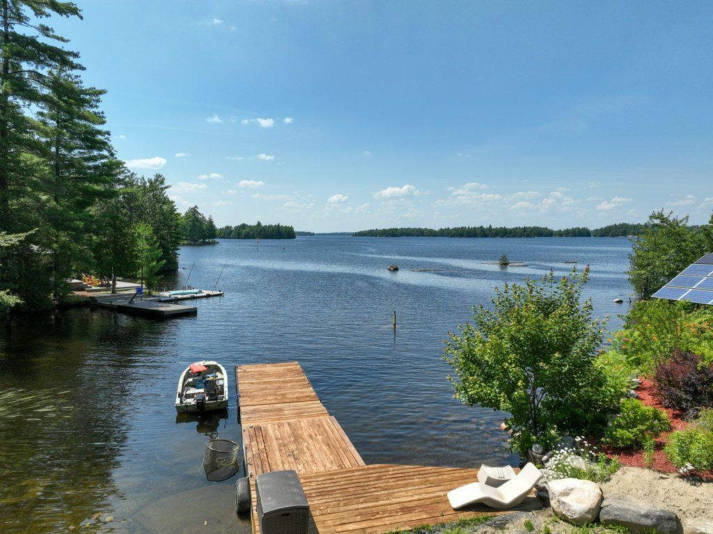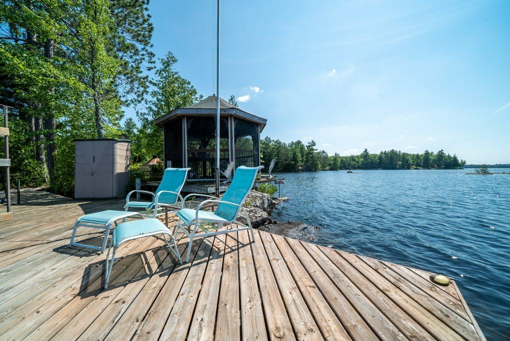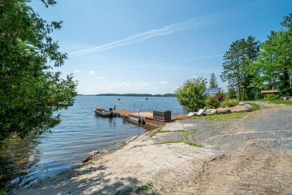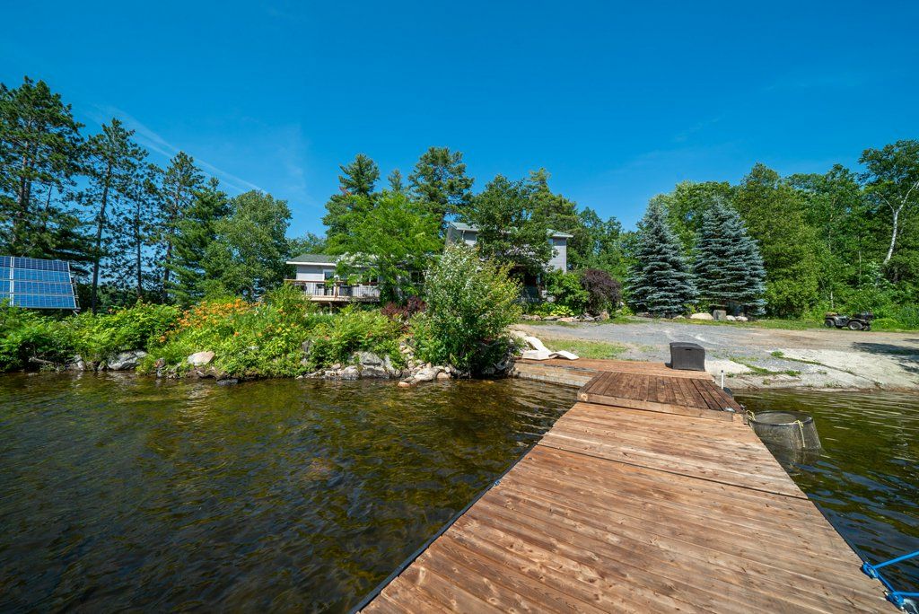 Nestled on 1.9 acres of land with an impressive 393 feet of waterfront access, this property features a private beach, docks for your watercraft, and deep swimming areas. As you gather in your lakeside gazebo, the west-facing orientation ensures you'll be treated to glorious sunsets sparkling over the lake and surrounding Canadian shield landscape every evening. This custom built 4 season solar powered home is a sanctuary boasting 5 bedrooms, 2 bathrooms, a primary bedroom with ensuite, main floor laundry, and entertaining kitchen, a living/family room with a cozy stone fireplace, and a dining/living room offering breathtaking lake views with a walkout to the screened sun porch. In addition the property provides a garage & workshop, boat port with steel shed, private boat launch, gardens shed and Bunkie with hydro and plenty of grounds for all your family entertainment. For those who crave adventure, fishing, hunting, and trails are just a stone's throw away from your future doorstep. Big Gull Lake itself is an 18 km long gem featuring 75% crown land for you to explore at your leisure. The lake is teeming with abundant fish species for the avid angler; 2 marinas with boat services & groceries. The Outback Solar System is capable of 2875 watts, 12 panel (250 watts each), 12 batteries 6 volt (48 volt storage system) 100 amp service, house & garage; propane powered HWT on demand, stove, dryer & back up 2020 Cummins generator; 1 Napolean Wood Firestove & Stone Fireplace.