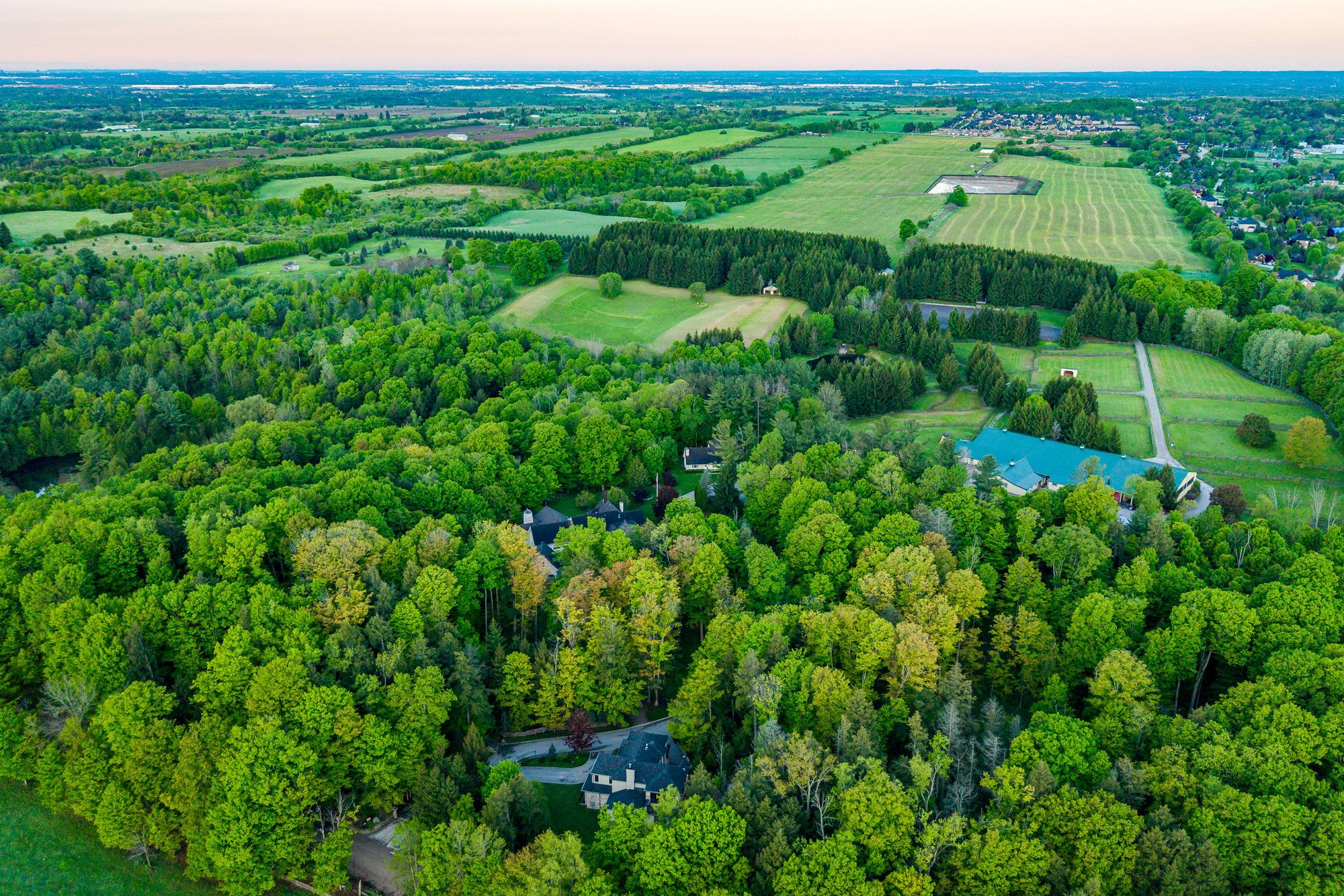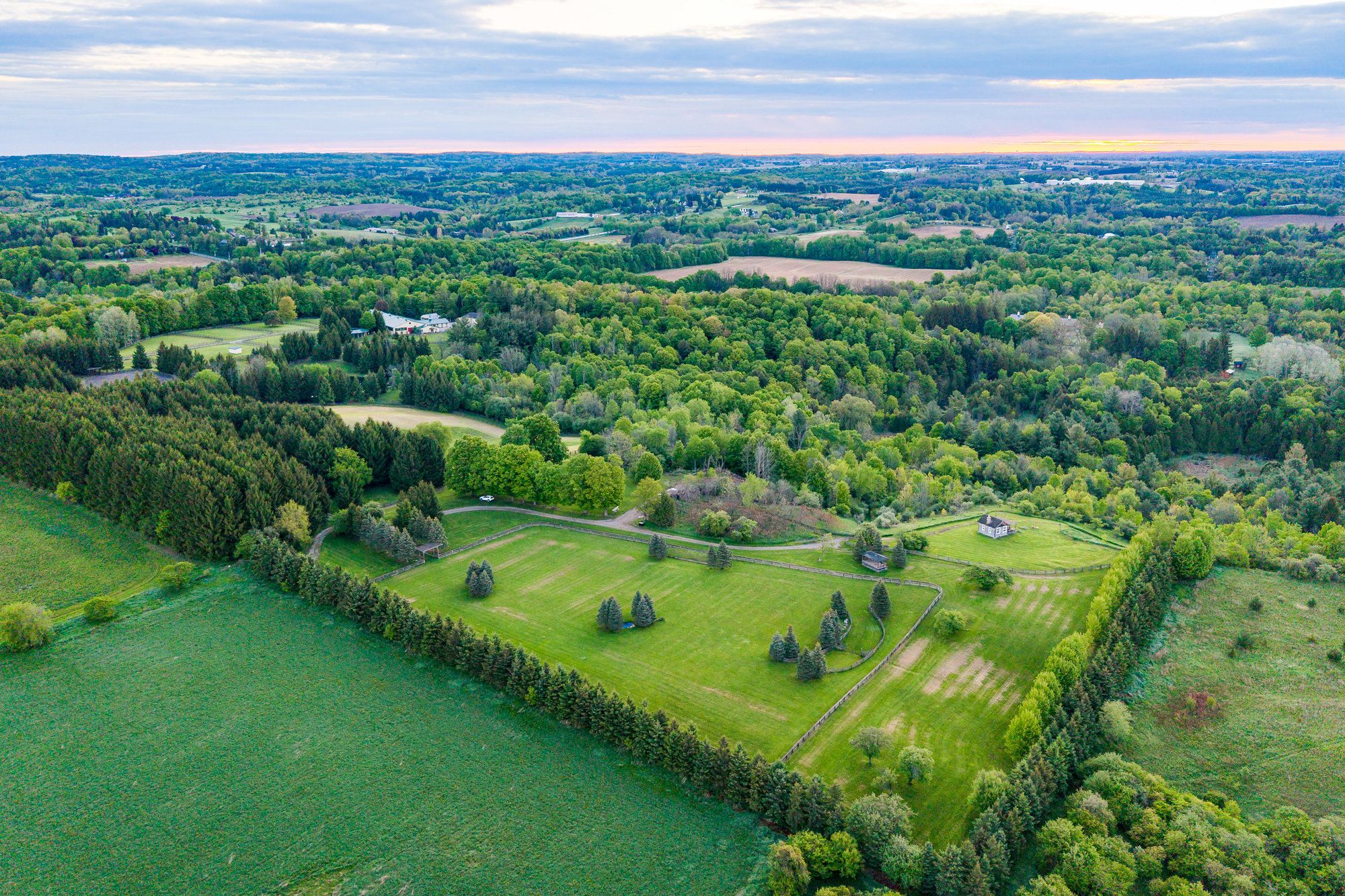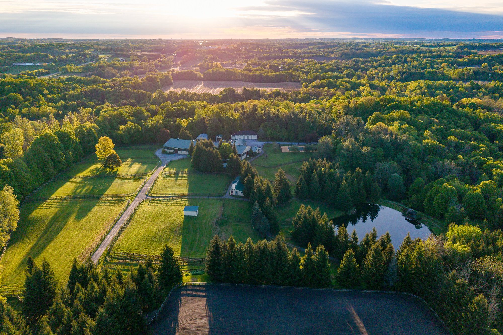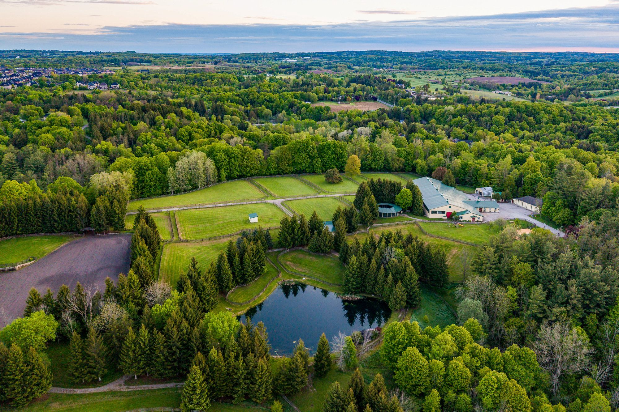 Family Compound; equestrian business; live and lease. So many options for one of the finest equestrian estates in Ontario's renowned King Township; without question a premier community in the horse world. Wingberry Farms spans 75 acres of scenic, rolling land with open paddocks, mature forest, and private trails that lead past a stunning pond with waterfalls and up to the most enchanting hilltop log cabin where you can enjoy sweeping sunrise and sunset views. All of this only 45 minutes north of Toronto. The property includes three distinct homes: 1: The gate house (a newly built custom residence(2018) with 4+2 bedrooms and 7 bathrooms, nanny suite, oversized decks and private forested backyard with hot tub and fire pit, open concept living with a gym & theatre downstairs; 2: The main house-a timeless traditional with 4 bedrooms, multiple outdoor siting areas and outdoor kitchen, spectacular great room and indoor pool and spa amenities (2019), detached garage with apartment above; 3: A well-kept guest house with 4 bedrooms and a staff apartment below offering flexible space extended family, or rental income. Whether you're an avid equestrian, investor, or both this property delivers. Equestrian infrastructure is top-tier: a 32-stall main barn, an additional 6-stall stable, Olympic style, heated indoor arena, sand ring, and grass grand prix ring with cross-country elements. Gorgeous trails lead you through the forest to a river and ponds. Multiple paddocks (three with run-in shelters) offer varied turn out options, while equipment and vehicle storage is more than covered, with a 5-bay garage and two large heated workshops discreetly positioned on the property. Private, yet ideally located, Wingberry Farms is a strategic acquisition in a region where large parcels are increasingly rare. Designated village reserve lands make this an interesting prospective land banking opportunity.