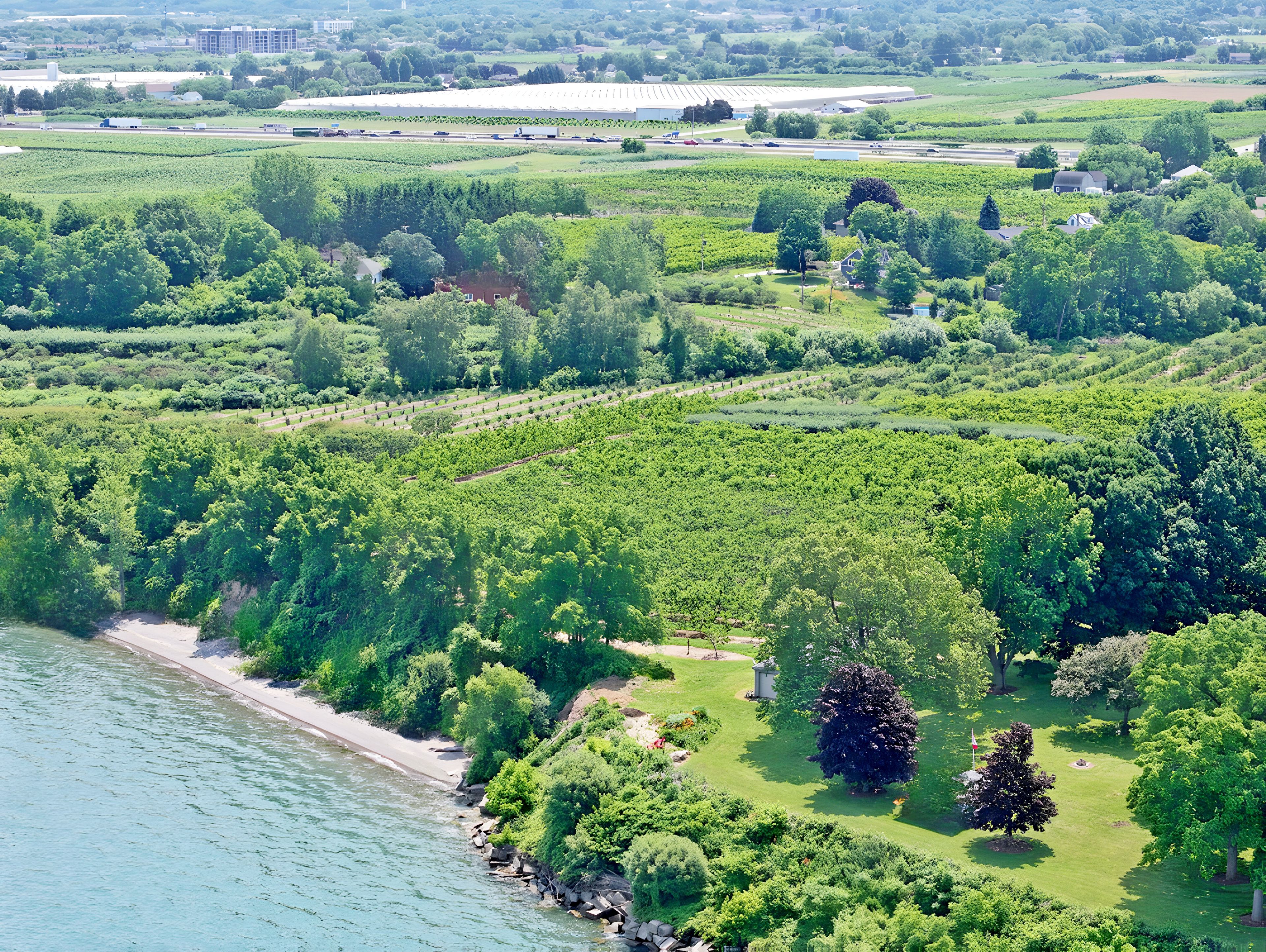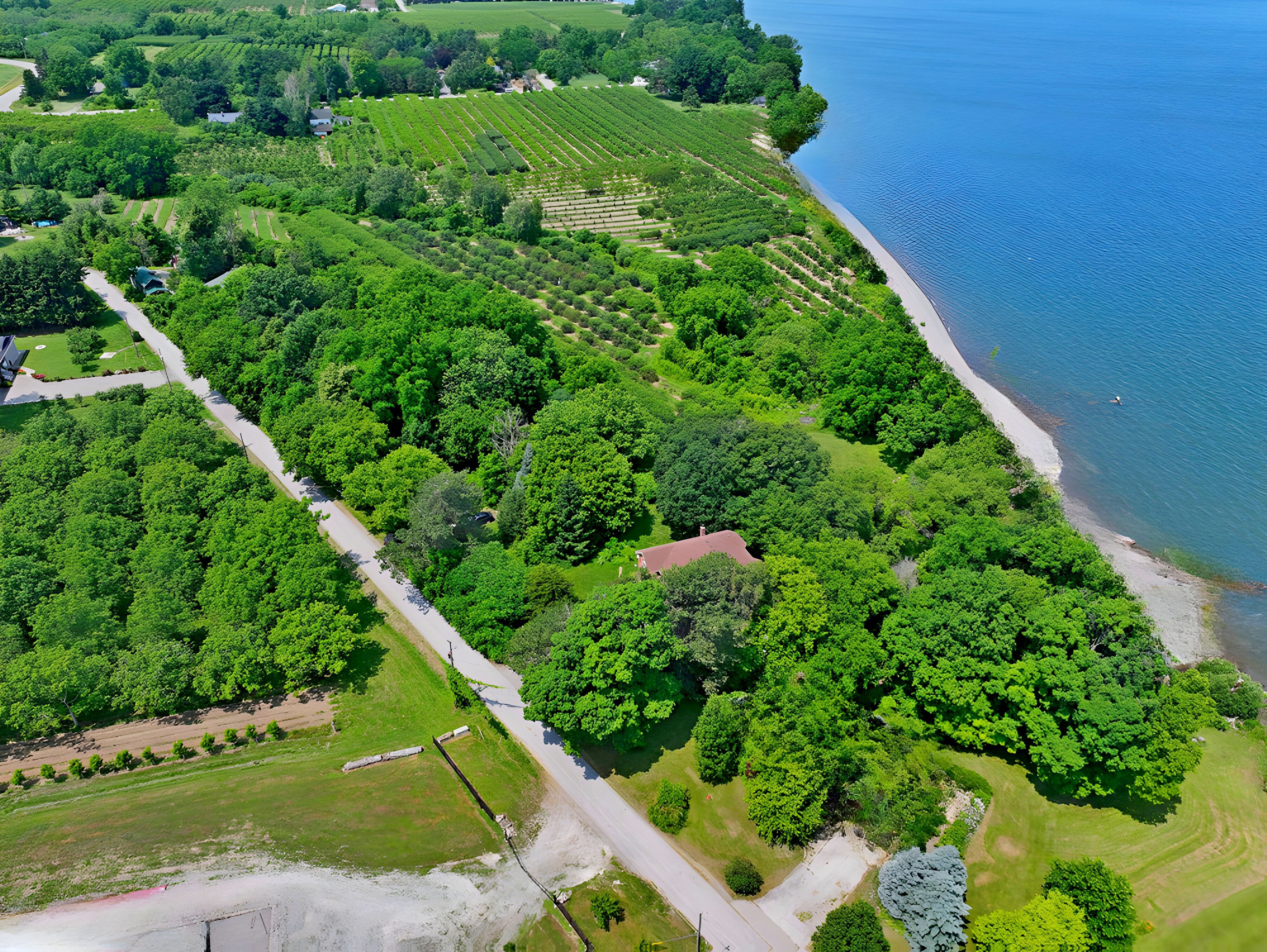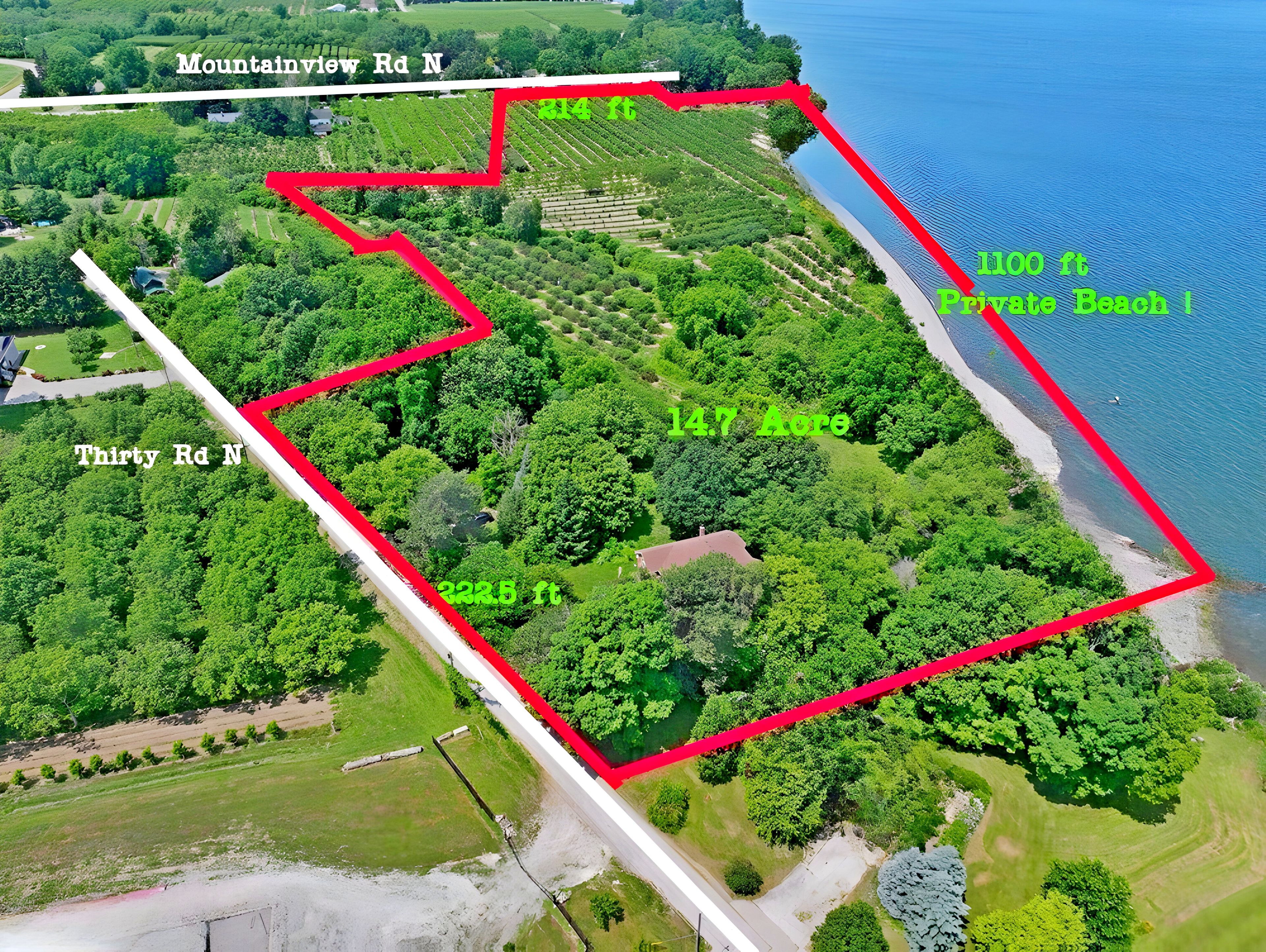 Possibly the most desirable Lake Ontario waterfront property from the GTA to the Niagara Region! This secluded 14.59-acre paradise is perfect for investors or those seeking a private lakefront retreat. Located on two quiet, scenic dead-end lakefront roads, the property offers over 200 ft of frontage on both Mountainview Rd and Thirty Rd N. Just minutes to the QEW, nearby towns, the future GO Station for high-speed rail connecting the GTA and Niagara Falls and approximately 3050 minutes to Hamilton, the GTA, Niagara Falls, and the U.S. border. Surrounded by rapidly growing developments along the QEW, the lands value is expected to increase significantly in the coming years. A private winding driveway leads to a well-built custom 2-storey villa (1989, original owner), set among mature pines and hardwoods. The home features 2,922 sq ft above grade plus a 1,393 sq ft walk-out lower-level in-law suite with lake views. A rustic boardwalk leads to your own untouched 1,100+ ft beach. Inside, you'll find spacious principal rooms with hardwood flooring, solid oak cabinetry, trim, and staircase. The upper level includes 4 bedrooms ,primary with 5-pc ensuite, and a guest suite with a 3-pc ensuite. Additional features: Two 6,000-gallon cisterns Inspected septic system 200-amp service Quality windows, brick exterior Roof (2020), Furnace (2021), A/C (2019), Central vac. Bonus: Vendor indicates a potential severance of a 1.5-acre homesite from an unopened road allowance , with approx. 13 acres remaining for a second residence. Most of the land is planted with fruit trees, maintained by a neighboring farmer. No reported income (likely HST exempt). Vendor Take Back mortgage (VTB) available. Endless possibilities: Ideal for a luxury estate, B&B, wedding venue, winery with lakefront dining, or seniors retreat, Lakeside Greenhouse and Recreation Complex . Quiet, scenic, and truly one of a kind. A rare opportunity must be seen!