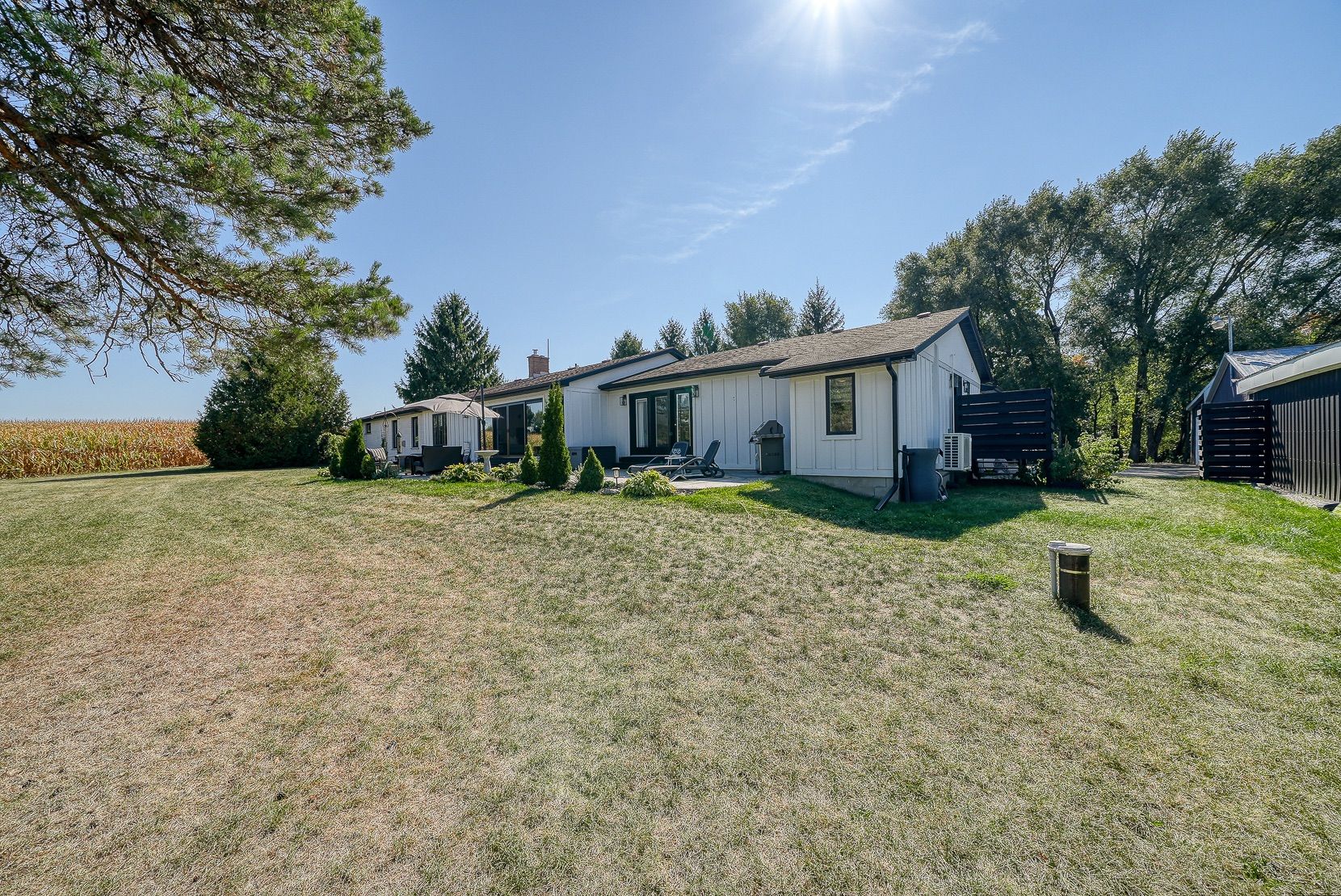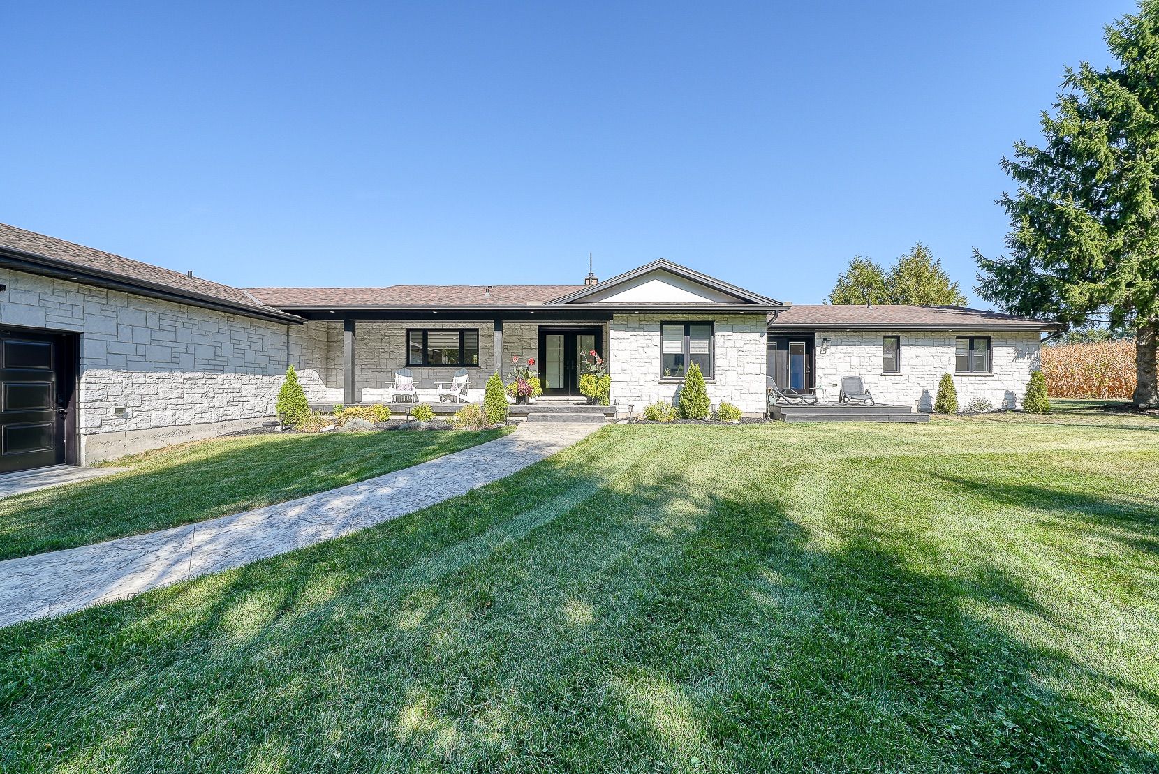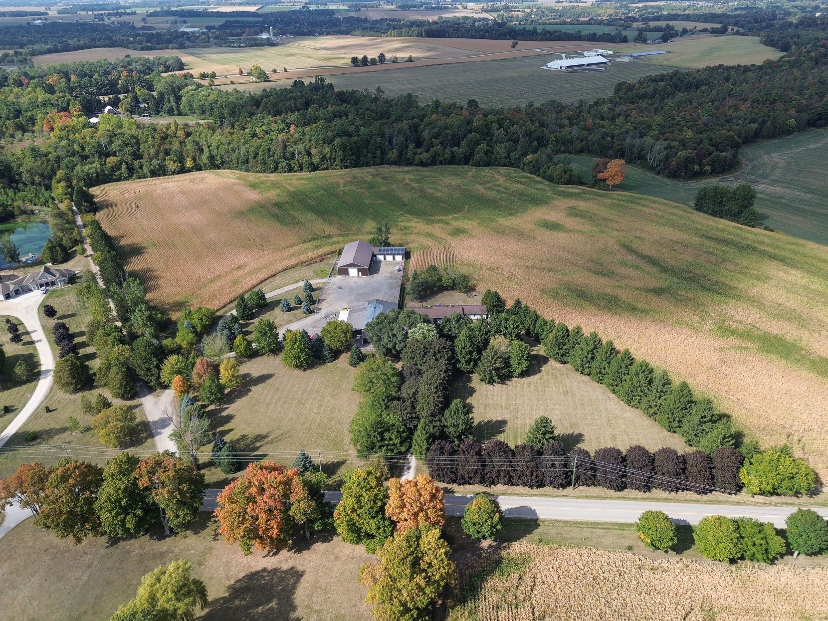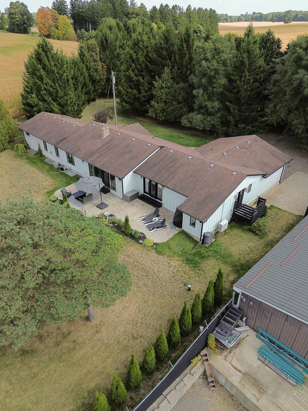 Welcome to a private ranch-style retreat, set on 37.85-42 acres and designed for those who value elegance, comfort, and space. A tree-lined laneway leads to this stunning residence, where contemporary stone and brickwork, a paved entry, and multiple garages (9 in total, including a heated and air-conditioned 2-car attached) set the tone for sophistication. Inside, the open-concept layout pairs luxury with functionality. The chefs kitchen features custom cabinetry, granite counters, and premium stainless appliances, seamlessly flowing to the dining area and stamped concrete patio, perfect for entertaining. A granite fireplace with WETT-certified insert offers warmth and style.The primary suite is a sanctuary with vaulted ceilings, a gas fireplace, two walk-in closets, a private terrace, and a spa-inspired ensuite with dual vanities, freestanding tub, walk-in shower, and separate bidet room. A spacious in-law suite with its own deck and ensuite offers comfort for extended family or guests.The light-filled lower level features oversized windows, a full bath, and versatile space for a gym, office, or rec room. Solid wood oversized doors and vaulted ceilings add timeless character throughout. Beyond the home, income opportunities abound with rental shop/office space, farmland, solar panels, and a fenced compound. Modern upgrades include on-demand hot water, water treatment system, and a 15kw roof-mounted solar system with off-grid potential.This estate blends luxury living with country serenity, offering space, privacy, income potential and lifestyle all in one just outside of town.