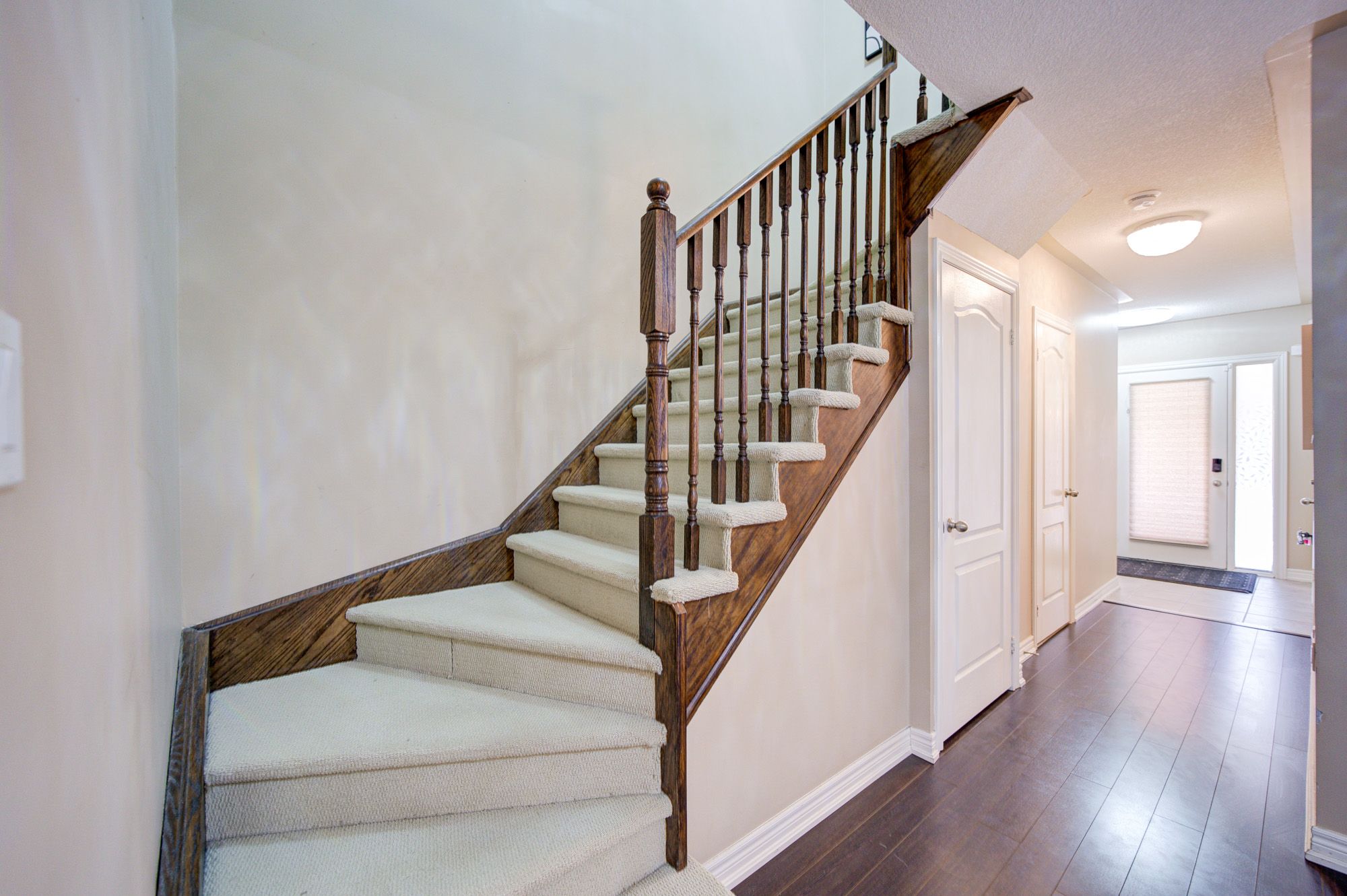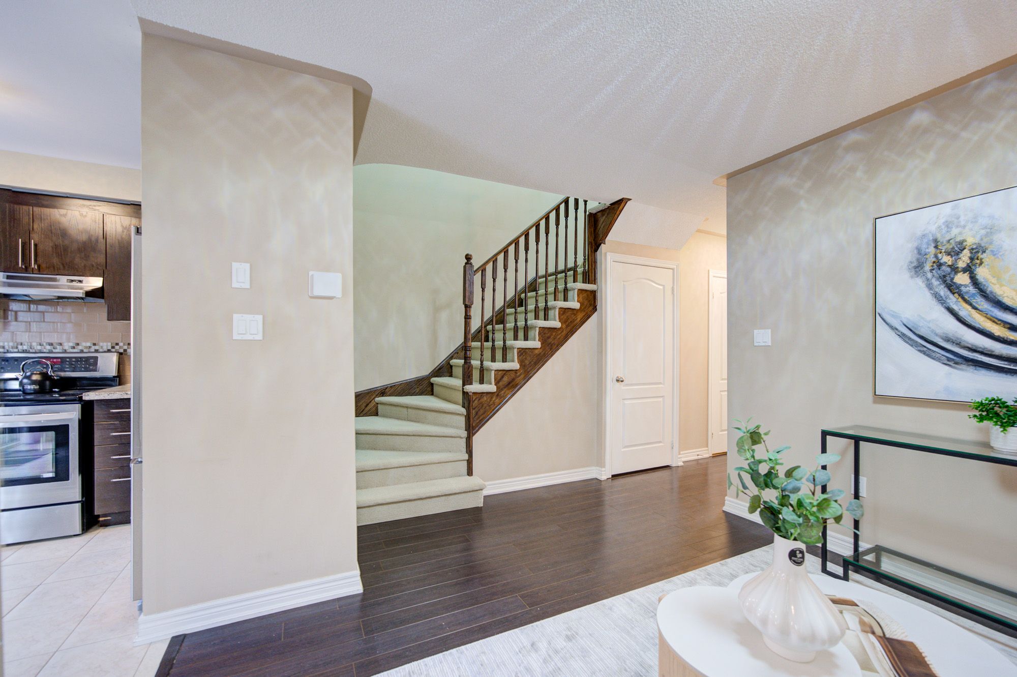 Well-maintained and move-in ready 3-bedroom townhome with three bathrooms, ideally located in a desirable neighbourhood. Bright and functional main floor with abundant natural light, a bathroom, and direct access from the one-car garage into the main level.The kitchen features granite countertops, ceramic backsplash, espresso cabinetry, upgraded faucets, and a breakfast area with walkout to backyard and deck.Recent upgrades include new modern light fixtures, updated bathrooms, and upgraded furnace and hot water tank, offering peace of mind and low ongoing maintenance. The second floor offers three well-sized bedrooms filled with natural light, including a primary bedroom with his-and-hers closets and semi-ensuite access. One bedroom features a private balcony.The professionally finished basement includes a versatile recreation area and an additional bathroom, providing flexible space for extended family, a home office, or rental use. Close to schools, parks, shopping, transit, and major commuter routes. A solid, rent-ready home with excellent value.