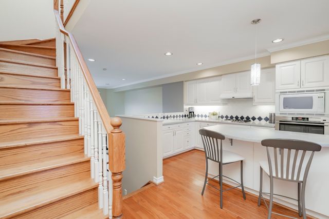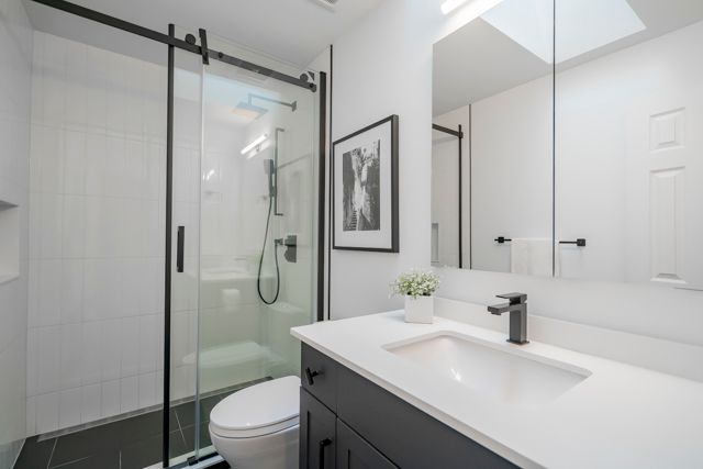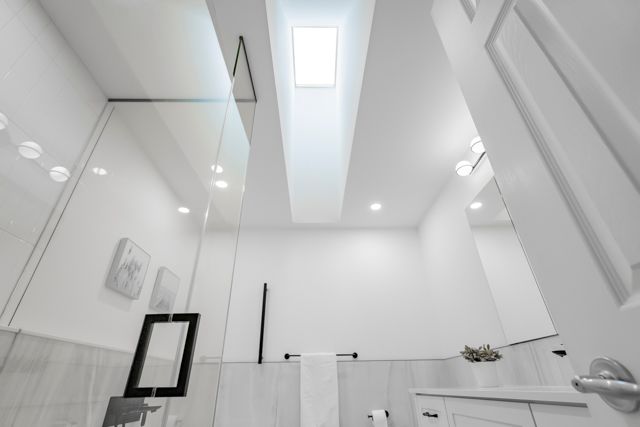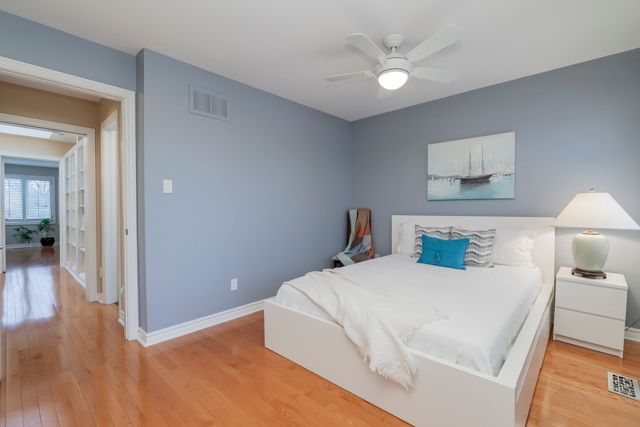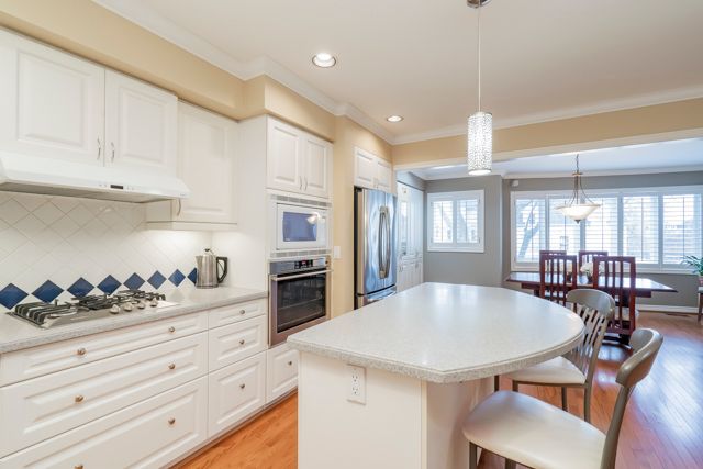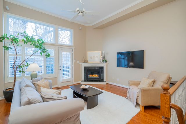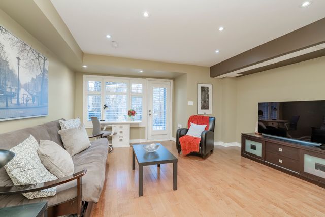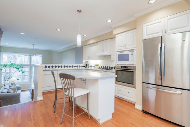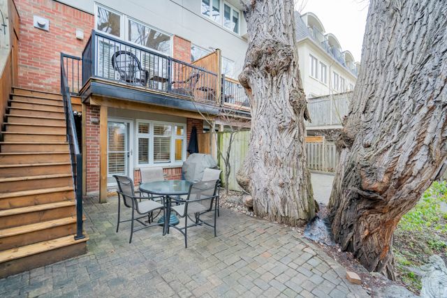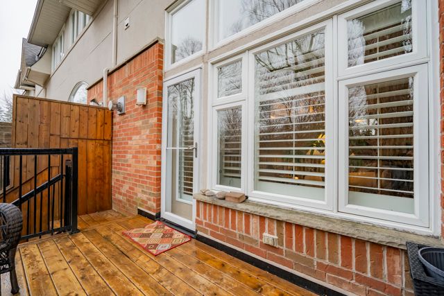This beautifully appointed executive freehold townhome is nestled in an exclusive enclave south of Lakeshore Road in Oakville. The home has large windows, high ceilings, three skylights and a full western exposure, providing exceptional natural light throughout. California shutters are on all windows in the home to optimize a streamlined look. The home features two bedrooms--the primary bedroom with an ensuite overlooks a treed backyard. Both bathrooms on the third floor have been professionally designed and extensively renovated completely to the studs. The ensuite bathroom combines comfort and modern elegance, with heated floors, a stunning glass-enclosed shower, stand-alone bathtub, and a skylight. The second third-floor 3-piece bathroom also has a beautiful glass enclosed shower with modern finishes and a skylight.The open and airy kitchen and dining room space faces west and has lots of windows. It includes a built-in pantry and cabinets and a built-in microwave. The living room features high ceilings and large windows with a walkout to the deck all overlooking a treed backyard. A set of stairs off the deck leads down to an expansive patio, perfect for relaxing and entertaining. The lower level features a 2-piece bathroom and a spacious family room filled with natural light and a walkout to the patio surrounded by trees, a perfect quiet space to relax or entertain. Steps to the lake and waterfront promenade. Nearby are Marina, Sixteen Mile Creek, shopping, cafes and restaurants, doctors, dentists, community centers, outdoor and indoor pools, tennis courts, library, vibrant entertainment, scenic parks, renowned private schools with a few minutes' drive to GO train Station.