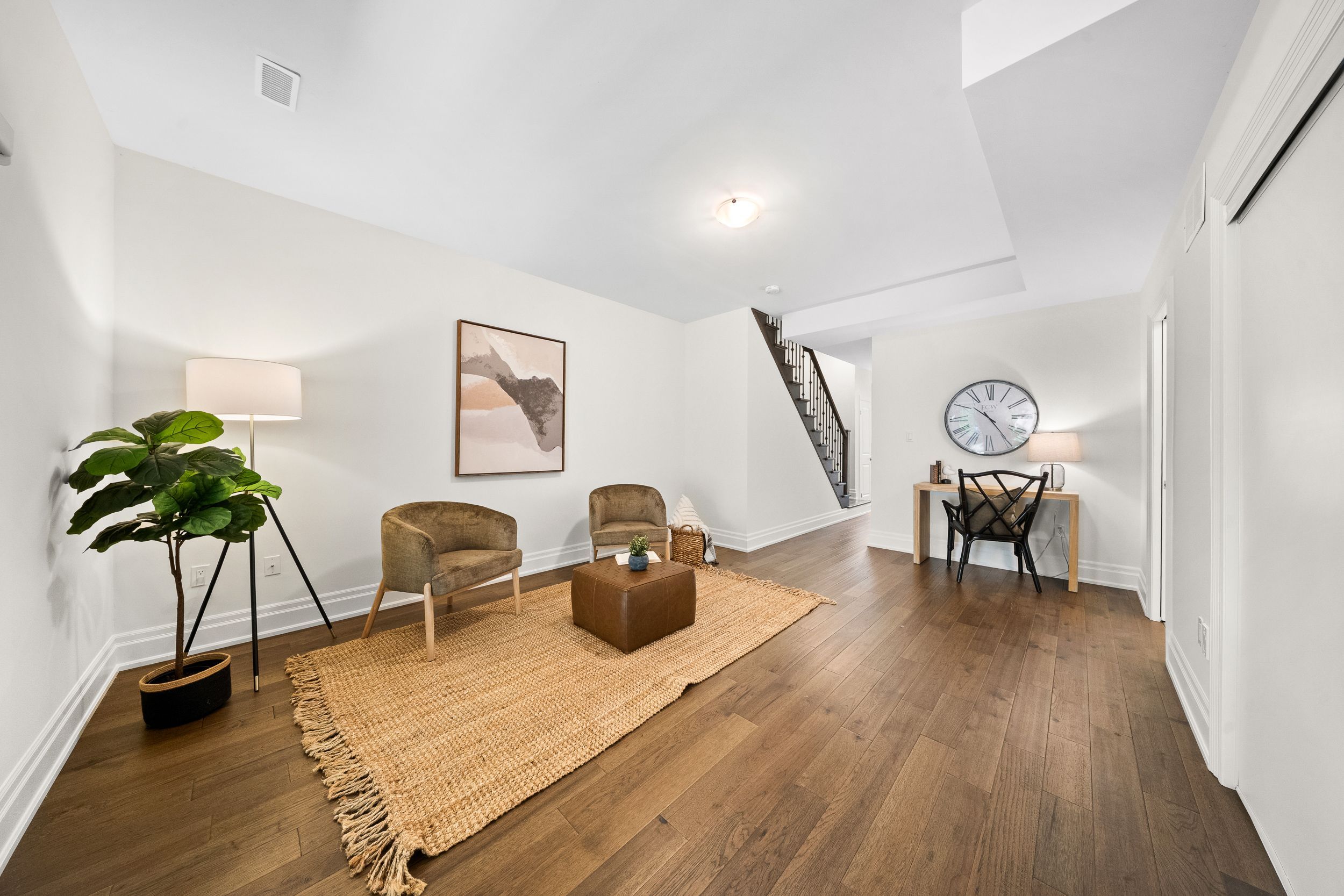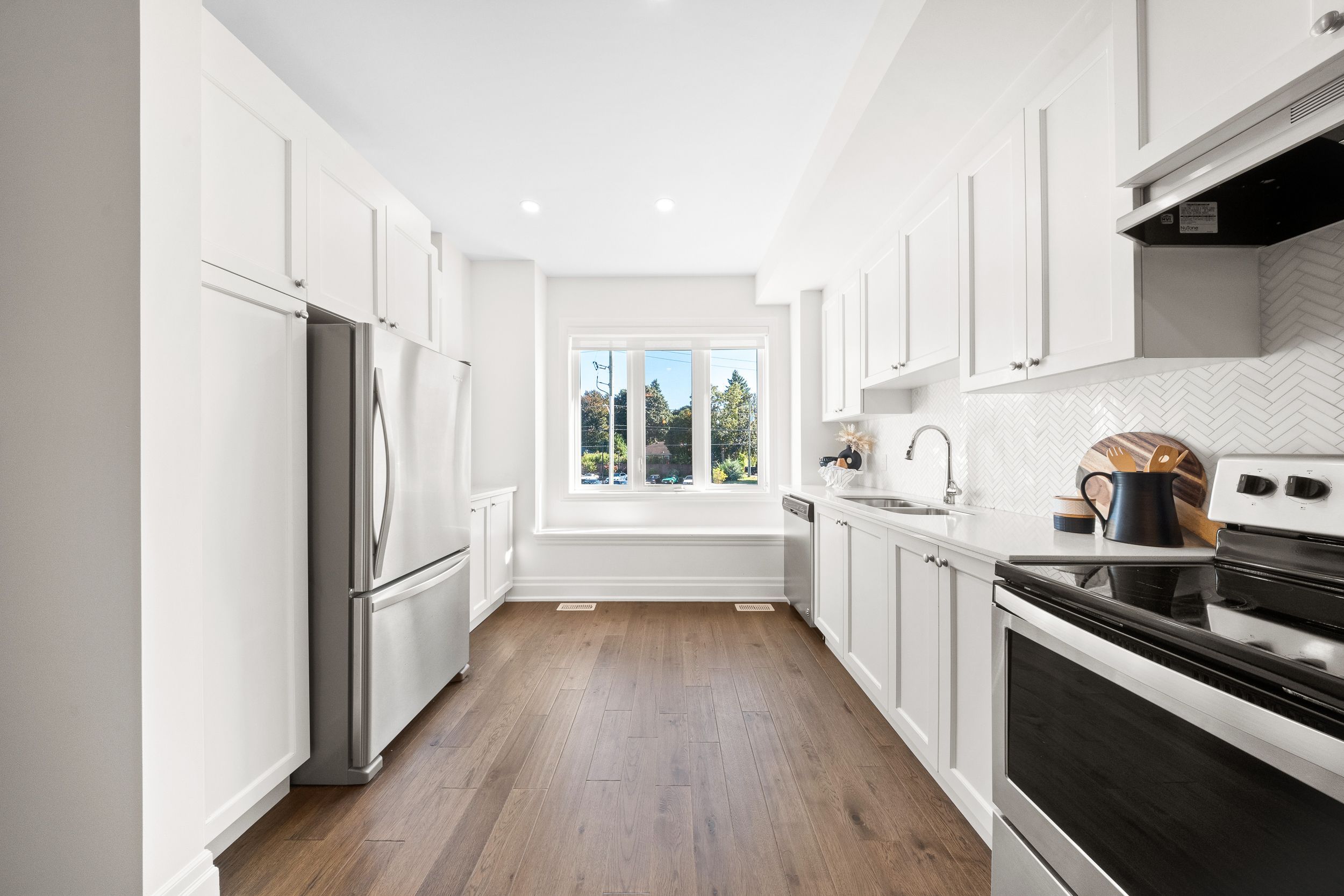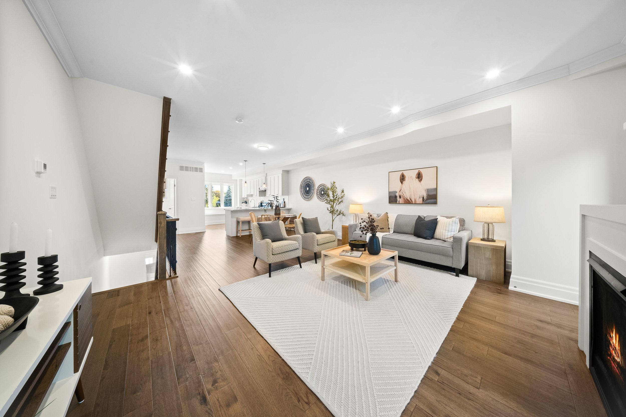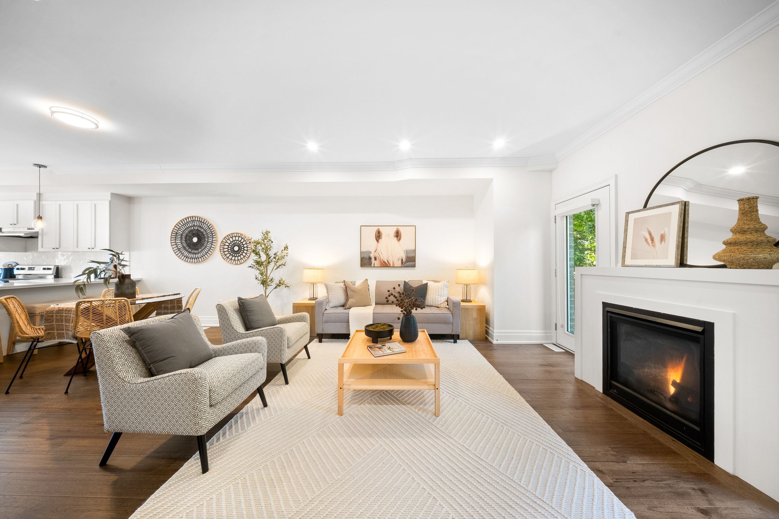 Welcome to this stunning and spacious 3-bedroom, 4-bathroom executive townhome, ideally situated in the heart of desirable Ancaster Village. Nestled in an exclusive 10-unit complex backing onto a private ravine, this meticulously maintained residence offers 2,000+ sq. ft. of beautifully designed living space with exceptional upgrades throughout. Step inside from the charming covered porch into a versatile flex space with direct access to the garage and a walkout to an exposed aggregate patio. A convenient 2-piece bath with quartz vanity completes this level extending your living space -ideal for a home office, recreation room, guest suite or even a 4th bedroom. The main level is designed for modern living and entertaining, featuring soaring 9-ft ceilings, crown moulding, hardwood floors, and pot lighting. A striking gas fireplace anchors the open-concept living room, with double doors leading to a deck overlooking the ravine- perfect for barbecuing. The bright dining area and crisp white kitchen boast quartz counters, a breakfast peninsula, gorgeous hexagon backsplash, stainless steel appliances, and ample cabinetry. Upstairs, the primary bedroom offers a walk-in closet and upgraded ensuite with a glass walk-in shower and ravine views. Two additional bedrooms, a full 4-piece bath with quartz vanity, and convenient upper-level laundry provide comfort and functionality. Located just steps from amenities-coffee shops, dining, bakeries, trails, schools, and boutique shopping-this move-in ready home combines luxury, convenience, and a serene natural setting. A rare opportunity to own a premium Ancaster townhome!