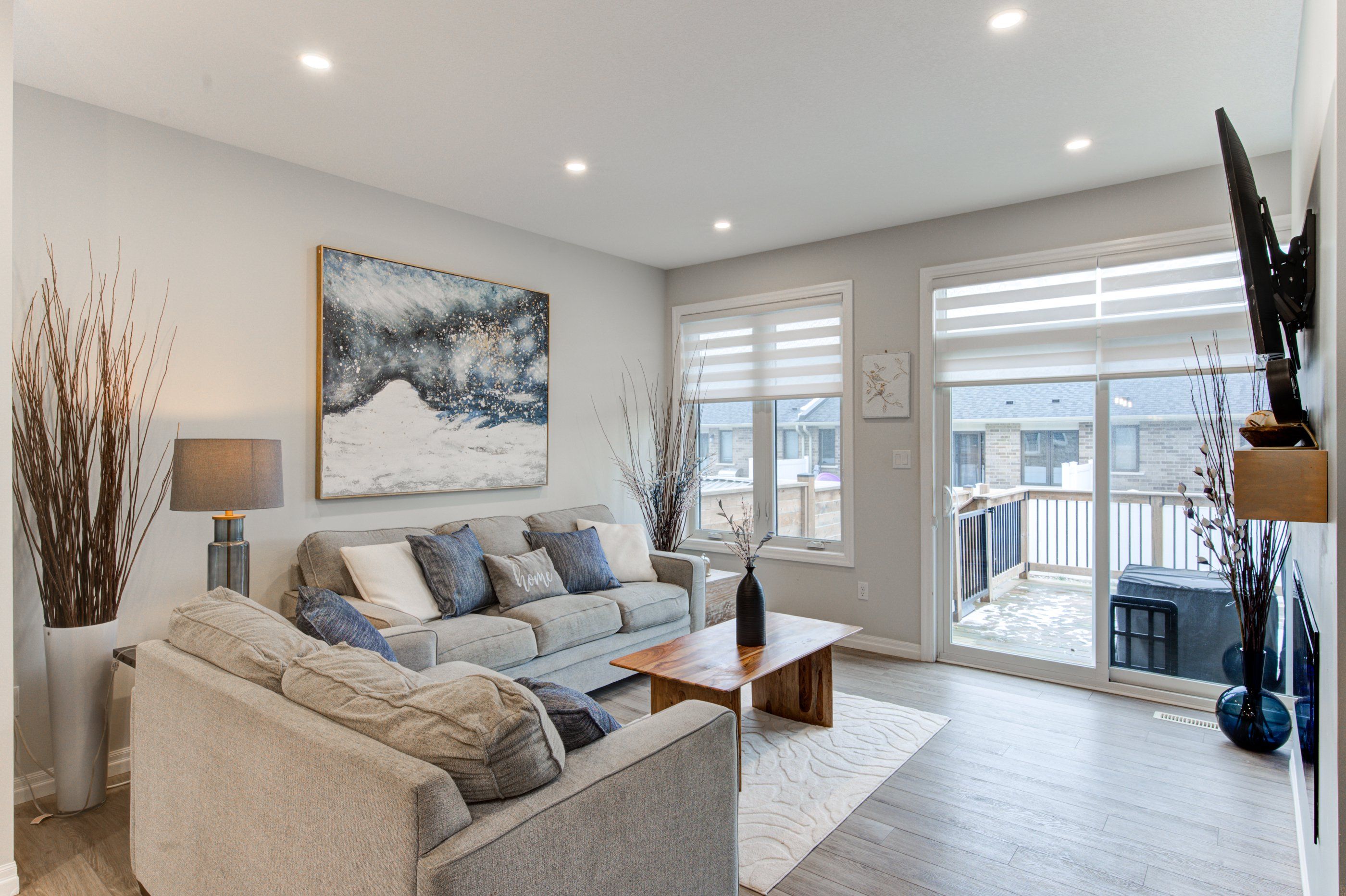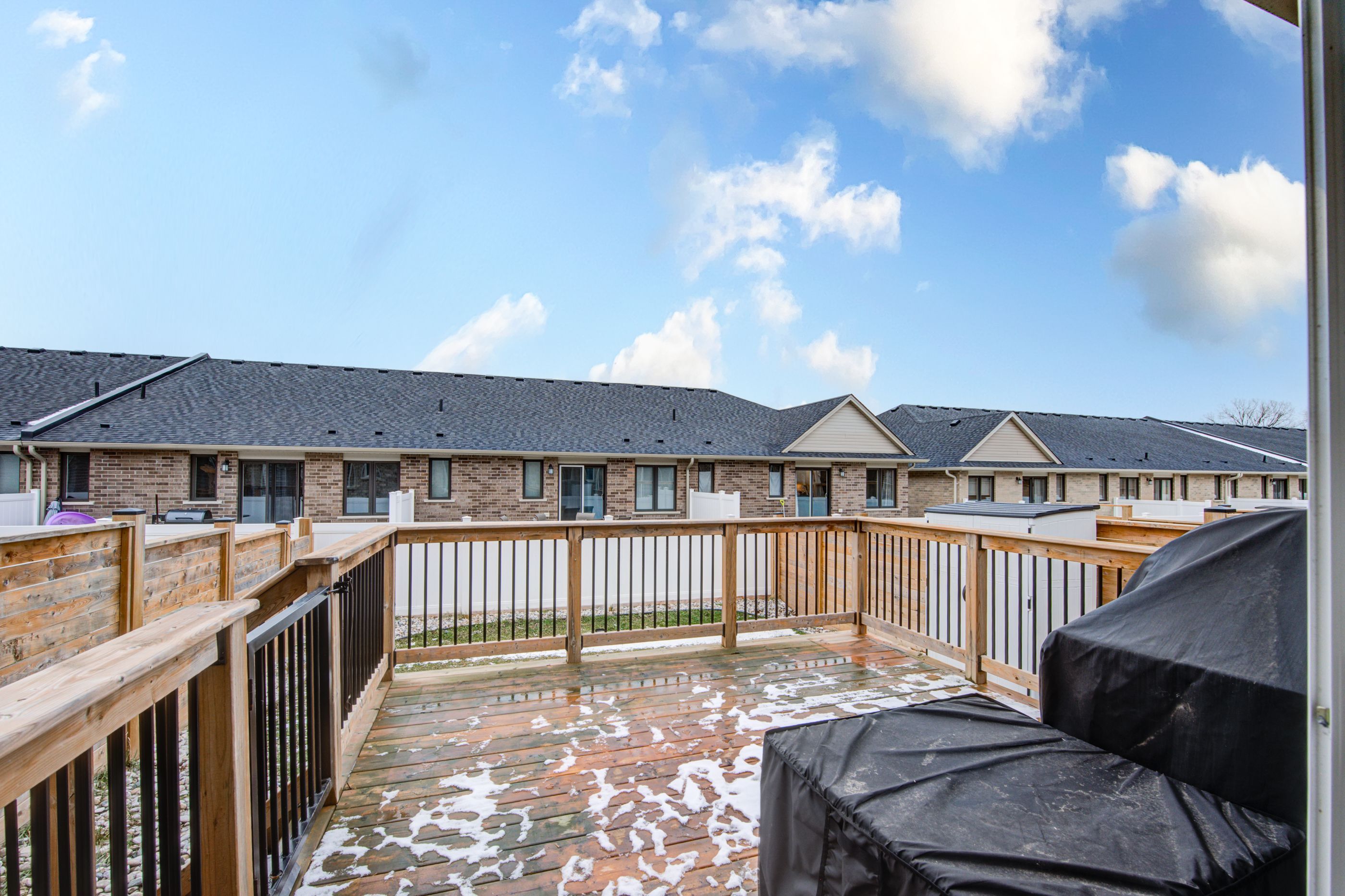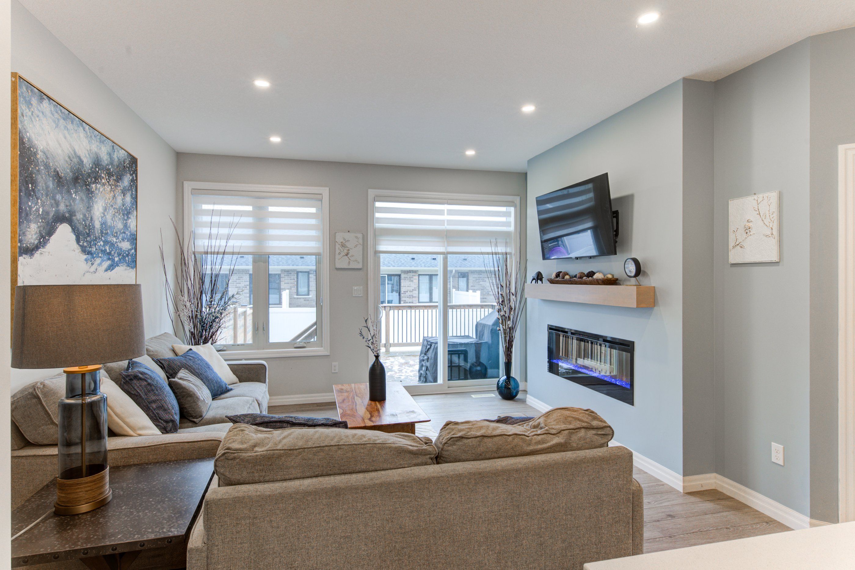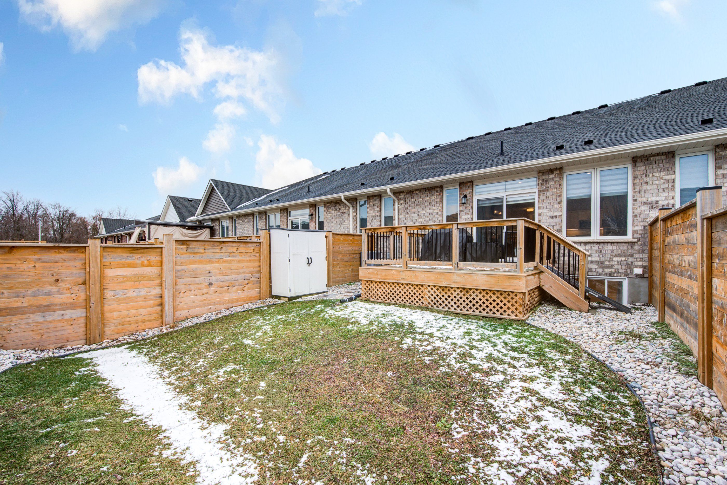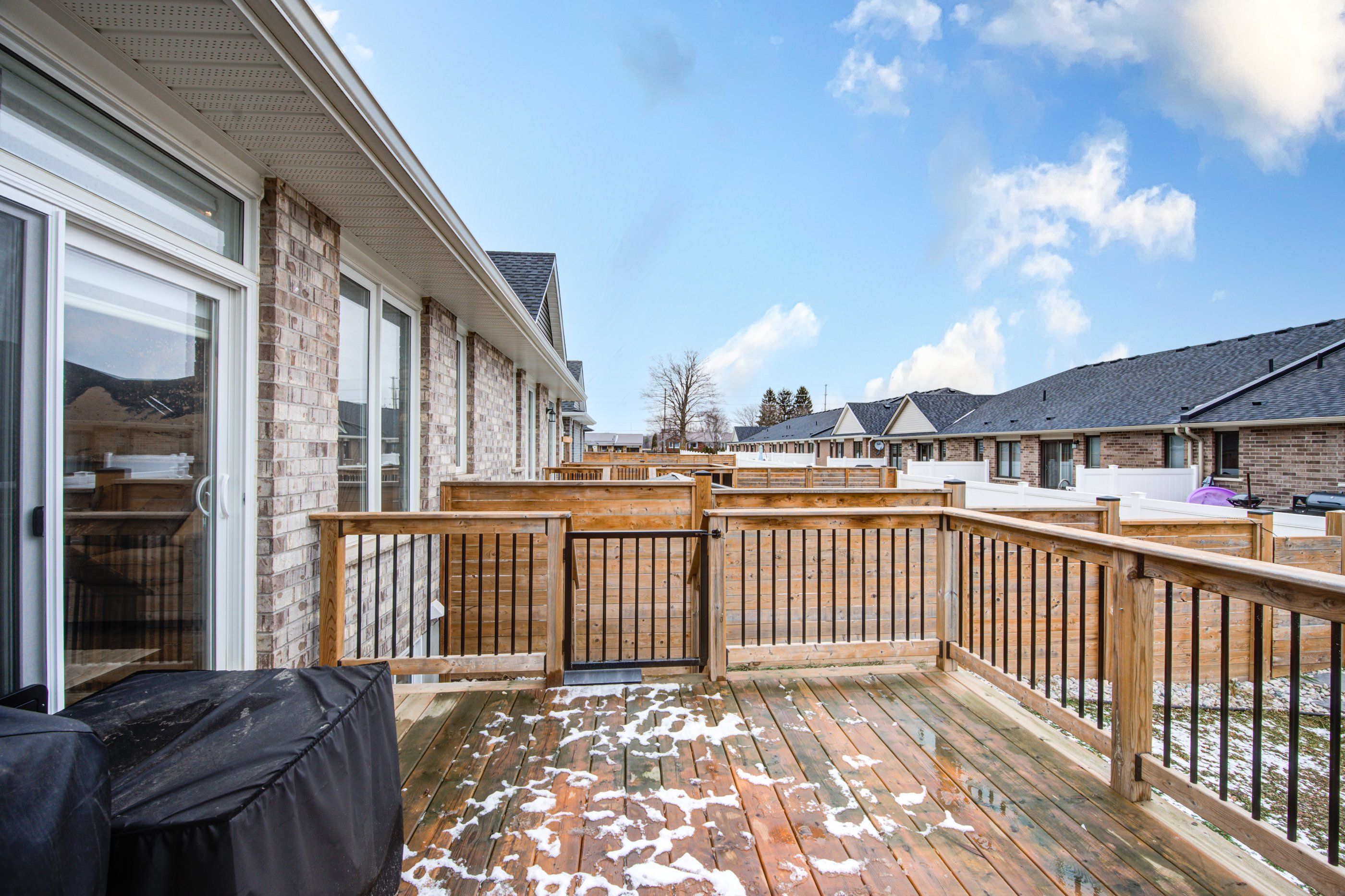 Built by award-winning Hayhoe Homes, this meticulously maintained freehold bungalow townhome offers stylish, low-maintenance living with no condo fees. The open-concept main floor features laminate flooring, quartz countertops, a large kitchen island with seating, tile backsplash, pantry, main-floor laundry, and a bright living area with an electric fireplace featuring adjustable LED flame colors. Patio doors lead to a fully fenced back deck, ideal for outdoor entertaining. The main level includes two bedrooms and two bathrooms, including a spacious primary suite with a four-piece ensuite, large double closets, and blackout blinds. The front room offers flexibility as a bedroom, home office, or den. Window blinds are installed throughout the upper level. The fully finished lower level offers a generous recreation room, third bedroom, four-piece bathroom, and ample storage-perfect for guests or extended family. Enjoy a fully fenced, dog-proof backyard with landscaped perennial gardens, stone accents, a custom gate off the deck, gas BBQ hookup, and a professionally installed storage shed. The attached garage measures19'1" x 10'10". Parking for three vehicles is provided with one garage space and two driveway spaces, freshly coated and sealed. Additional features include quality appliances, water softener, kitchen water filtration, Lifebreath air exchanger, and optional chest freezer. Located in a desirable neighborhood close to schools, parks, shopping, restaurants, and Highway 401 access, with an easy drive to London, Woodstock, and Lake Erie beaches. A beautifully maintained, move-in-ready home offering exceptional value and convenience-with no condo fees.