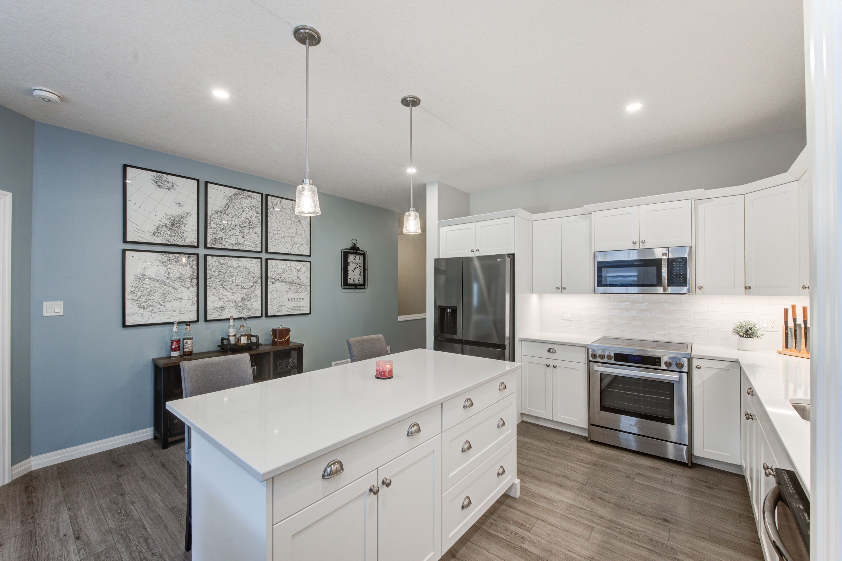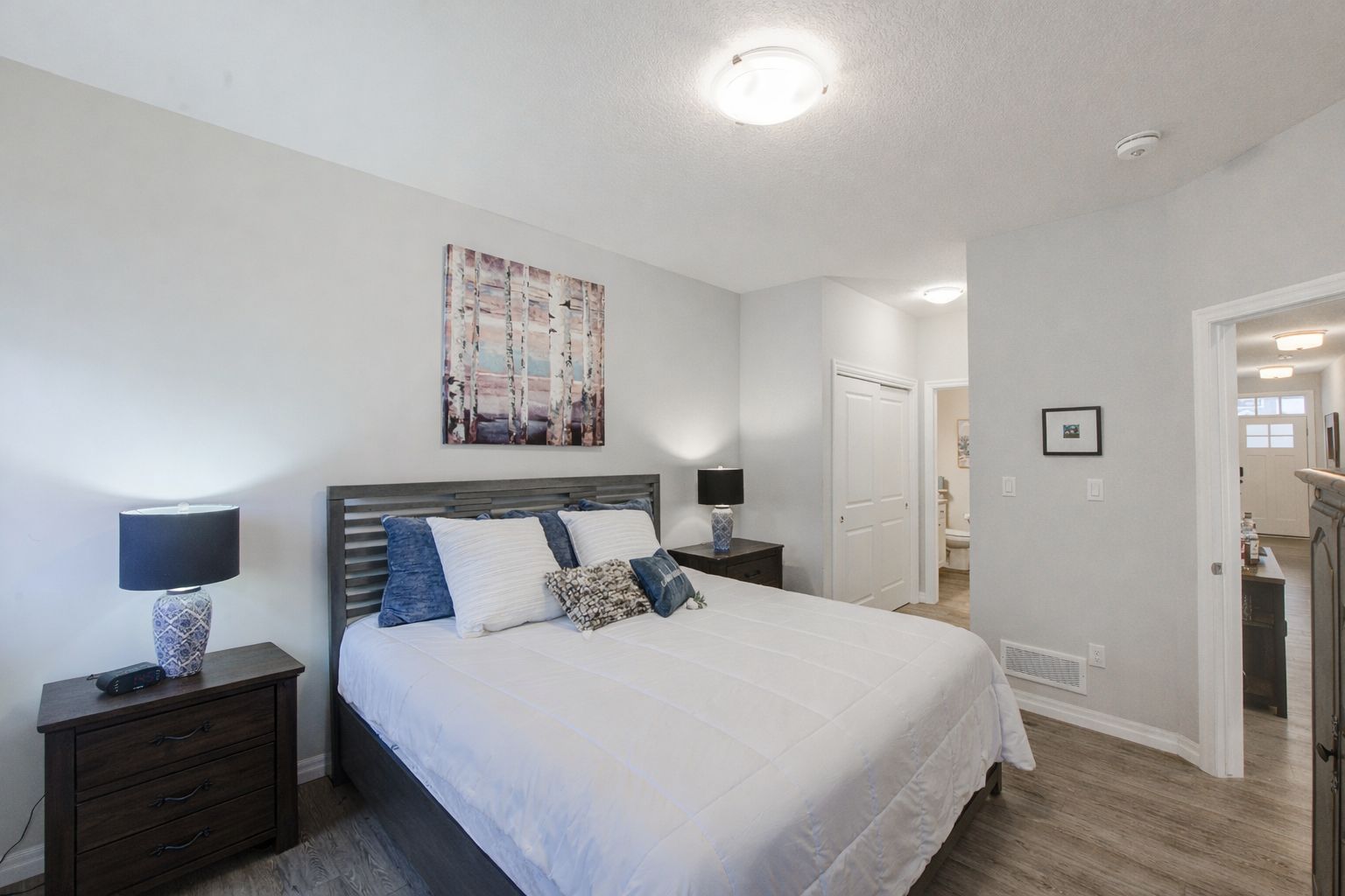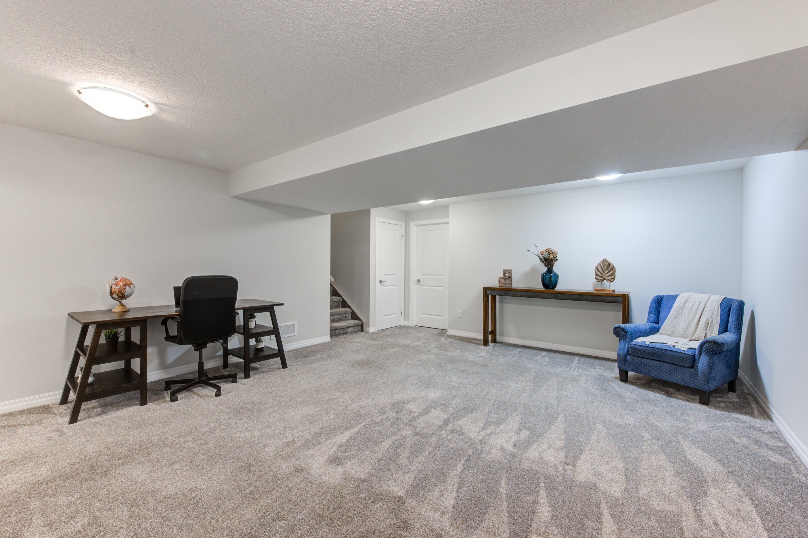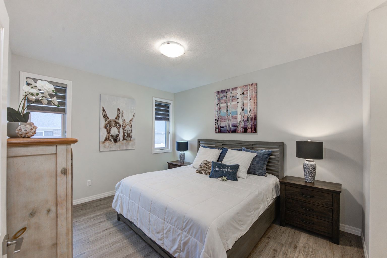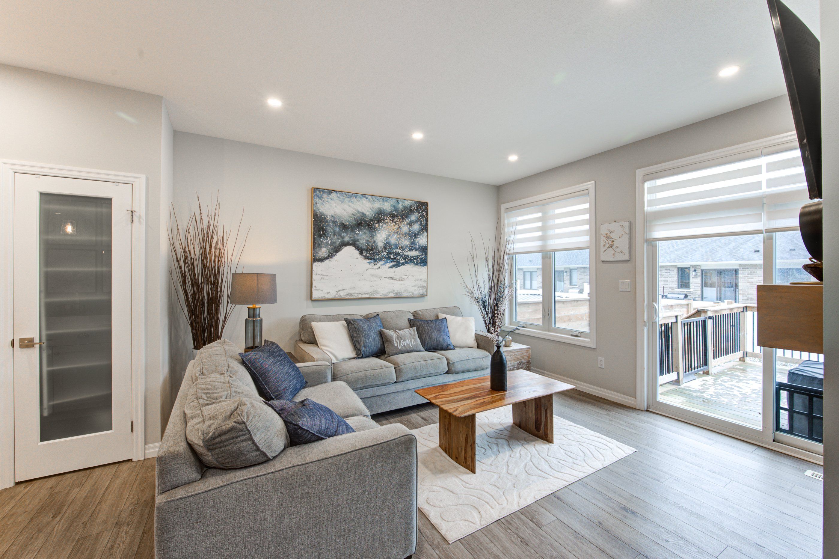 Built by award-winning Hayhoe Homes, this meticulously maintained freehold bungalow townhome offers stylish, low-maintenance living with no condo fees. The open-concept main floor features laminate flooring, quartz countertops, a large kitchen island with seating, tile backsplash, pantry, main-floor laundry, and a bright living area with an electric fireplace featuring adjustable LED flame colors. Patio doors lead to a fully fenced back deck, ideal for outdoor entertaining. The main level includes two bedrooms and two bathrooms, including a spacious primary suite with a four-piece ensuite, large double closets, and blackout blinds. The front room offers flexibility as a bedroom, home office, or den. Window blinds are installed throughout the upper level. The fully finished lower level offers a generous recreation room, third bedroom, four-piece bathroom, and ample storage-perfect for guests or extended family. Enjoy a fully fenced, dog-proof backyard with landscaped perennial gardens, stone accents, a custom gate off the deck, gas BBQ hookup, and a professionally installed storage shed. The attached garage measures19'1" x 10'10". Parking for three vehicles is provided with one garage space and two driveway spaces, freshly coated and sealed. Additional features include quality appliances, water softener, kitchen water filtration, Lifebreath air exchanger, and optional chest freezer. Located in a desirable neighborhood close to schools, parks, shopping, restaurants, and Highway 401 access, with an easy drive to London, Woodstock, and Lake Erie beaches. A beautifully maintained, move-in-ready home offering exceptional value and convenience-with no condo fees.