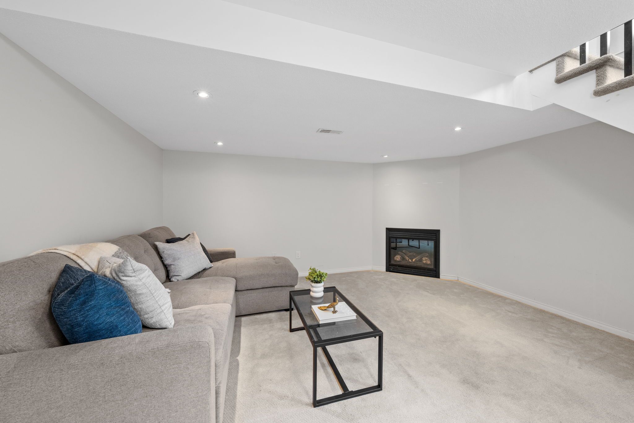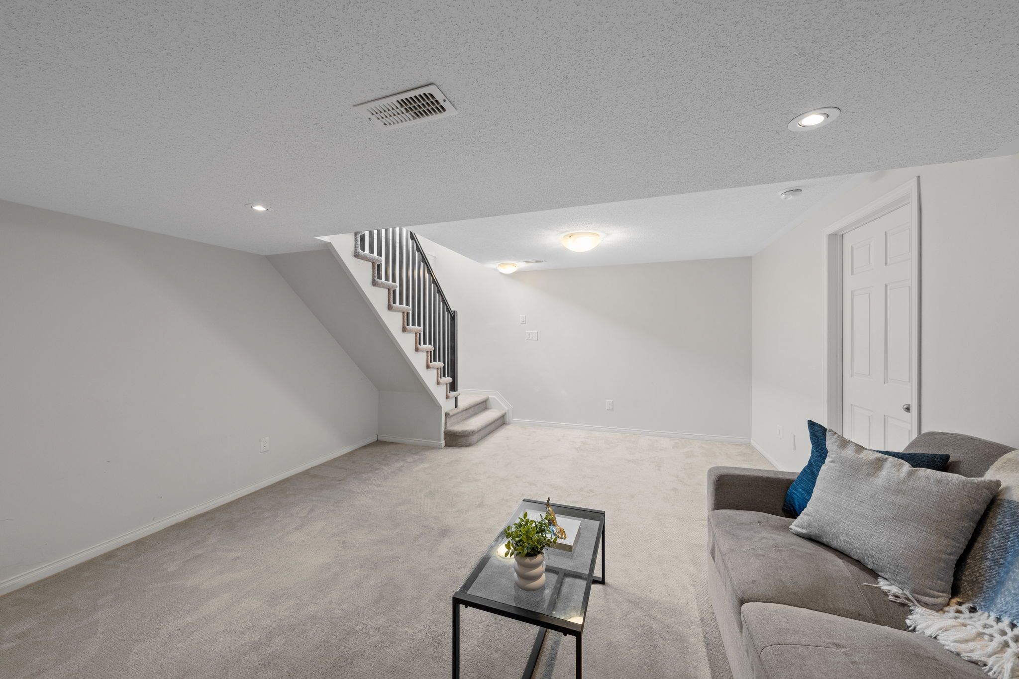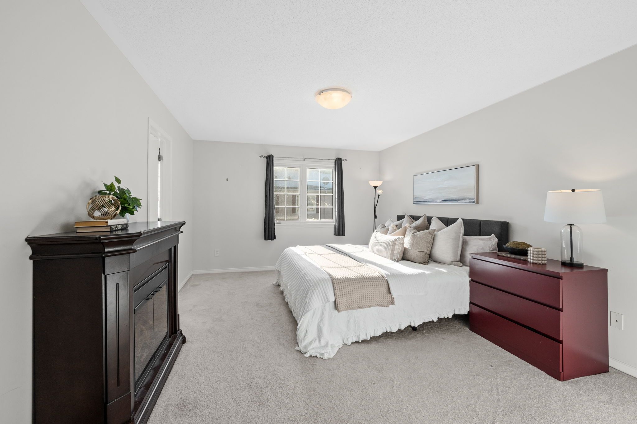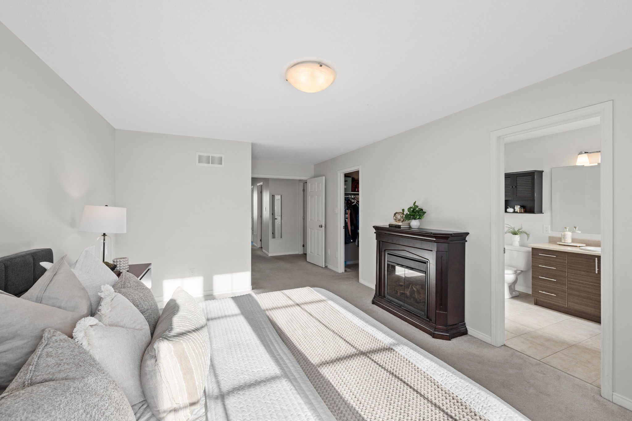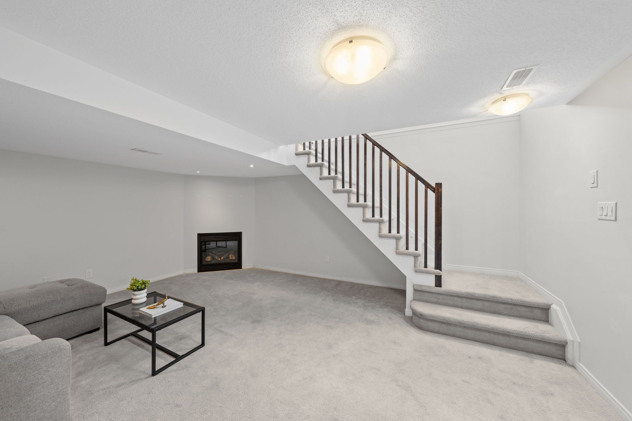 Nestled in Stonebridge, just moments from the Stonebridge Golf Club, walking trails, parks, schools, restaurants, and shops, this desirable Monarch National model offers a thoughtfully designed layout with three bedrooms, three bathrooms, and a finished lower level featuring a recreation room with a cozy fireplace.The main level boasts bright, open sightlines with living and dining areas enhanced by hardwood floors. The eat-in kitchen features quartz countertops, stainless steel appliances, and a peninsula that maximizes workspace. From the breakfast area, a patio door opens to the rear outdoor living space, complete with a patio, deck, and astroturf for easy maintenance. Upstairs, the spacious primary bedroom includes an electric fireplace, two walk-in closets for ample storage, and a four-piece ensuite. Two additional bedrooms, a full bathroom, and a convenient laundry room complete the upper level. Some photographs have been virtually staged. The association fee of $133.81 per month covers the maintenance of the common areas.