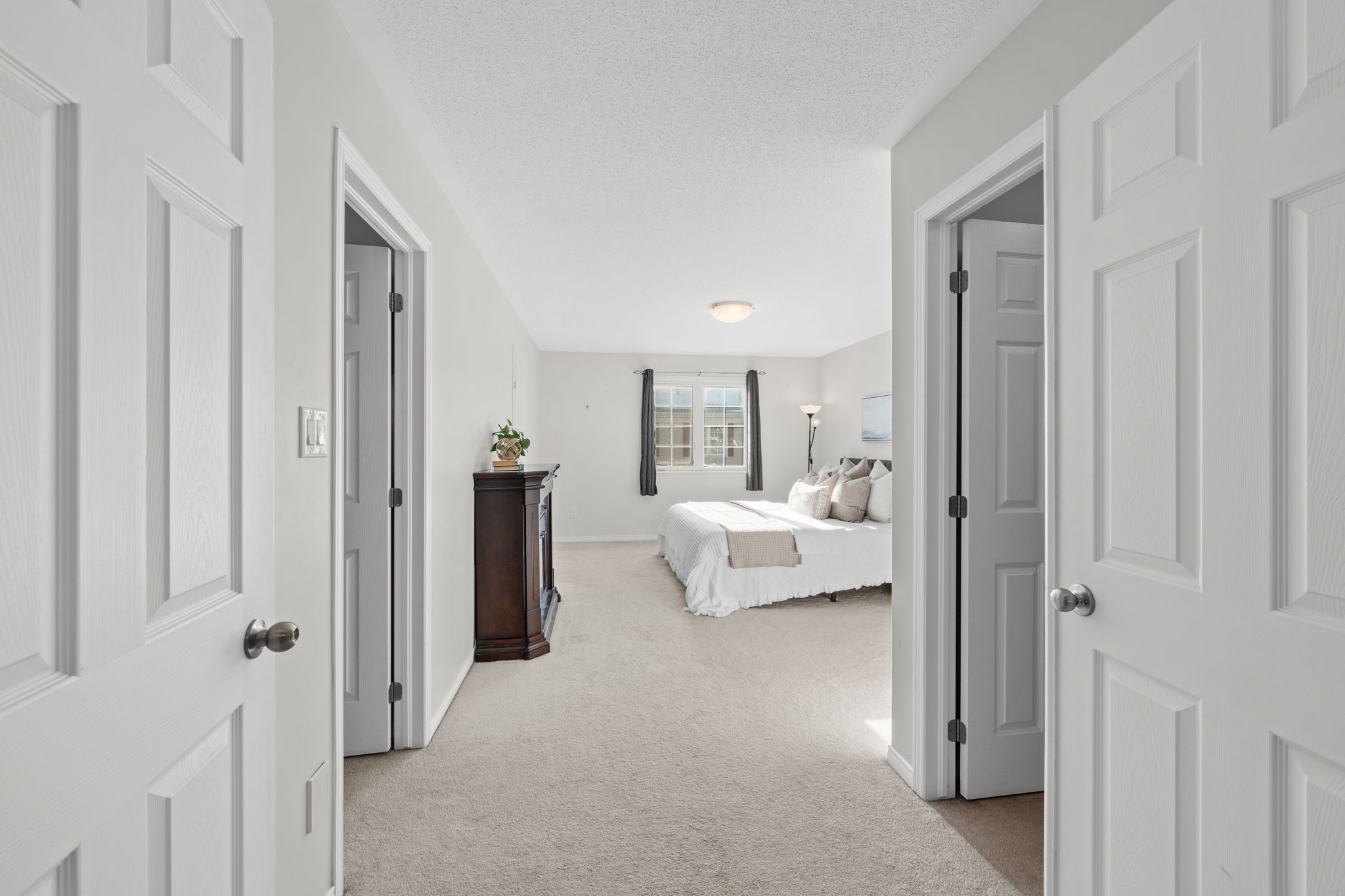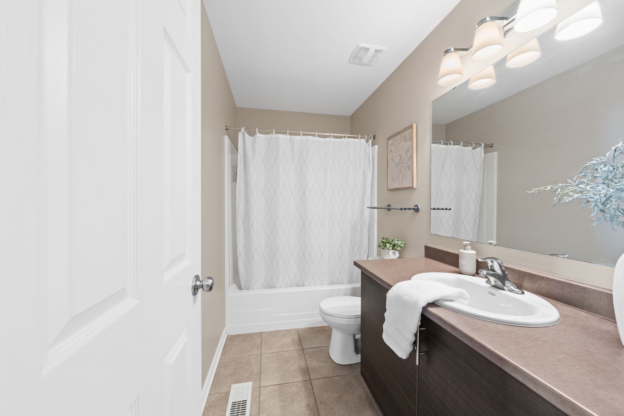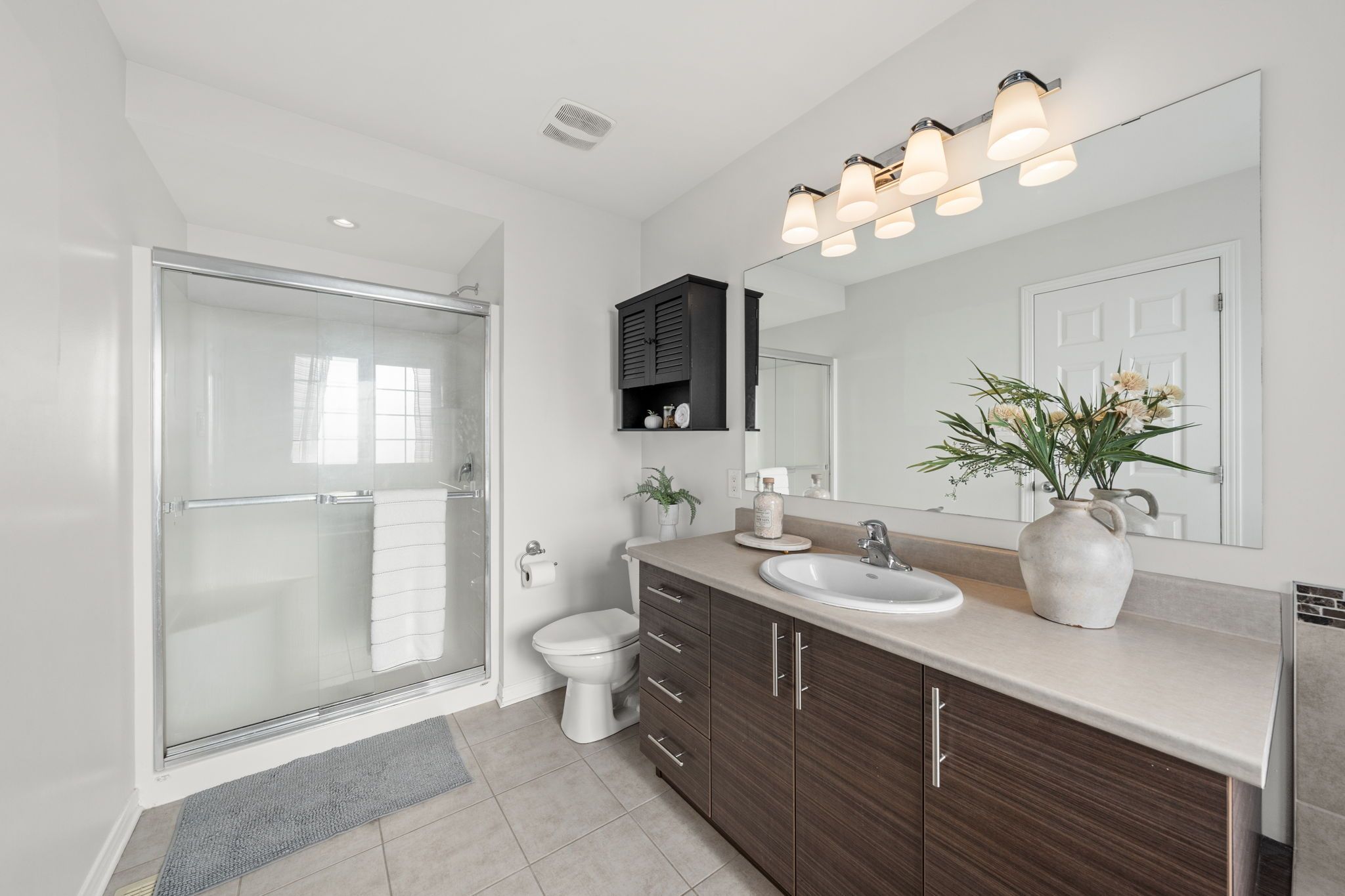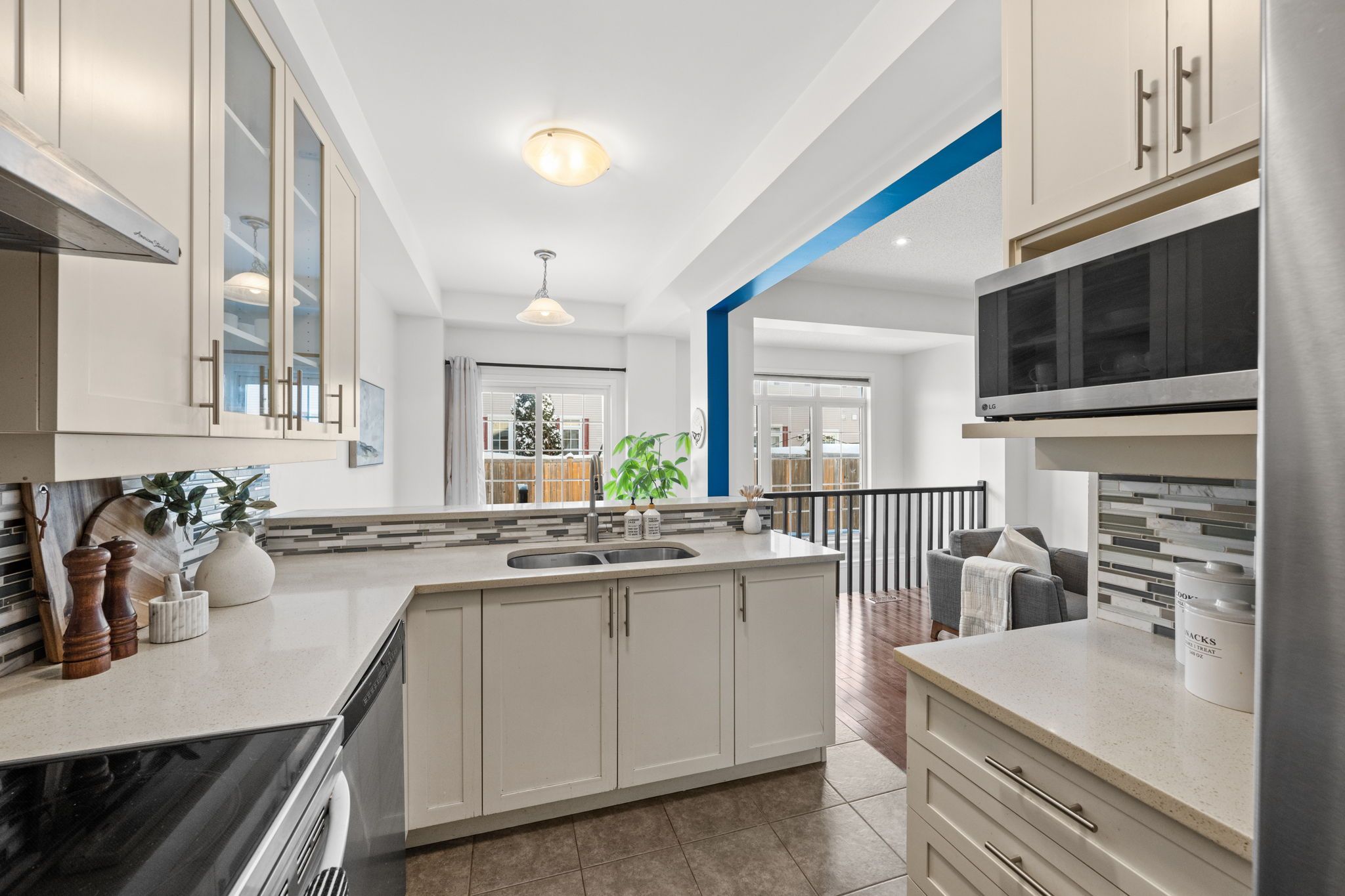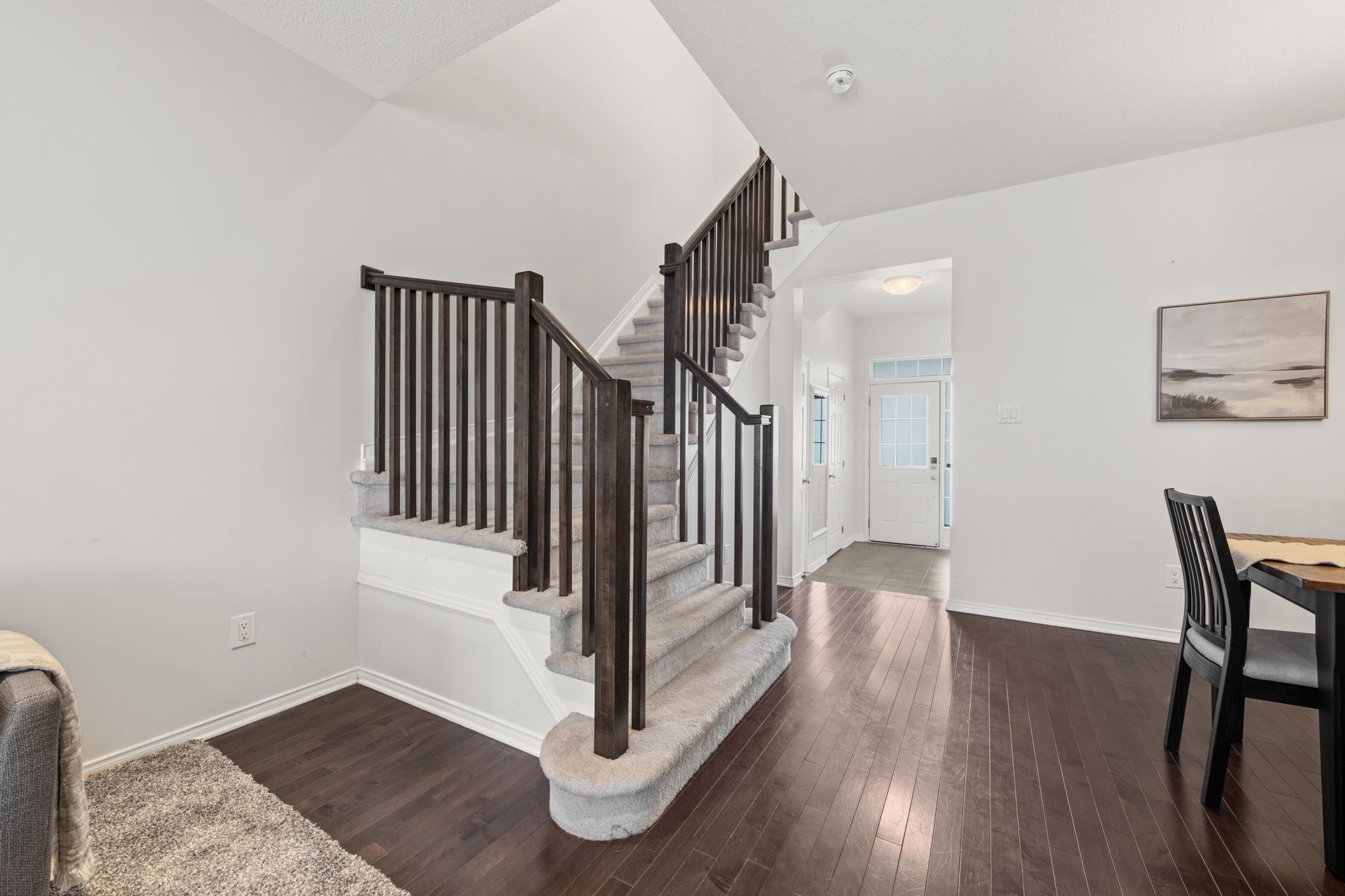 Nestled in Stonebridge, just moments from the Stonebridge Golf Club, walking trails, parks, schools, restaurants, and shops, this desirable Monarch National model offers a thoughtfully designed layout with three bedrooms, three bathrooms, and a finished lower level featuring a recreation room with a cozy fireplace.The main level boasts bright, open sightlines with living and dining areas enhanced by hardwood floors. The eat-in kitchen features quartz countertops, stainless steel appliances, and a peninsula that maximizes workspace. From the breakfast area, a patio door opens to the rear outdoor living space, complete with a patio, deck, and astroturf for easy maintenance. Upstairs, the spacious primary bedroom includes an electric fireplace, two walk-in closets for ample storage, and a four-piece ensuite. Two additional bedrooms, a full bathroom, and a convenient laundry room complete the upper level. Some photographs have been virtually staged. The association fee of $133.81 per month covers the maintenance of the common areas.
