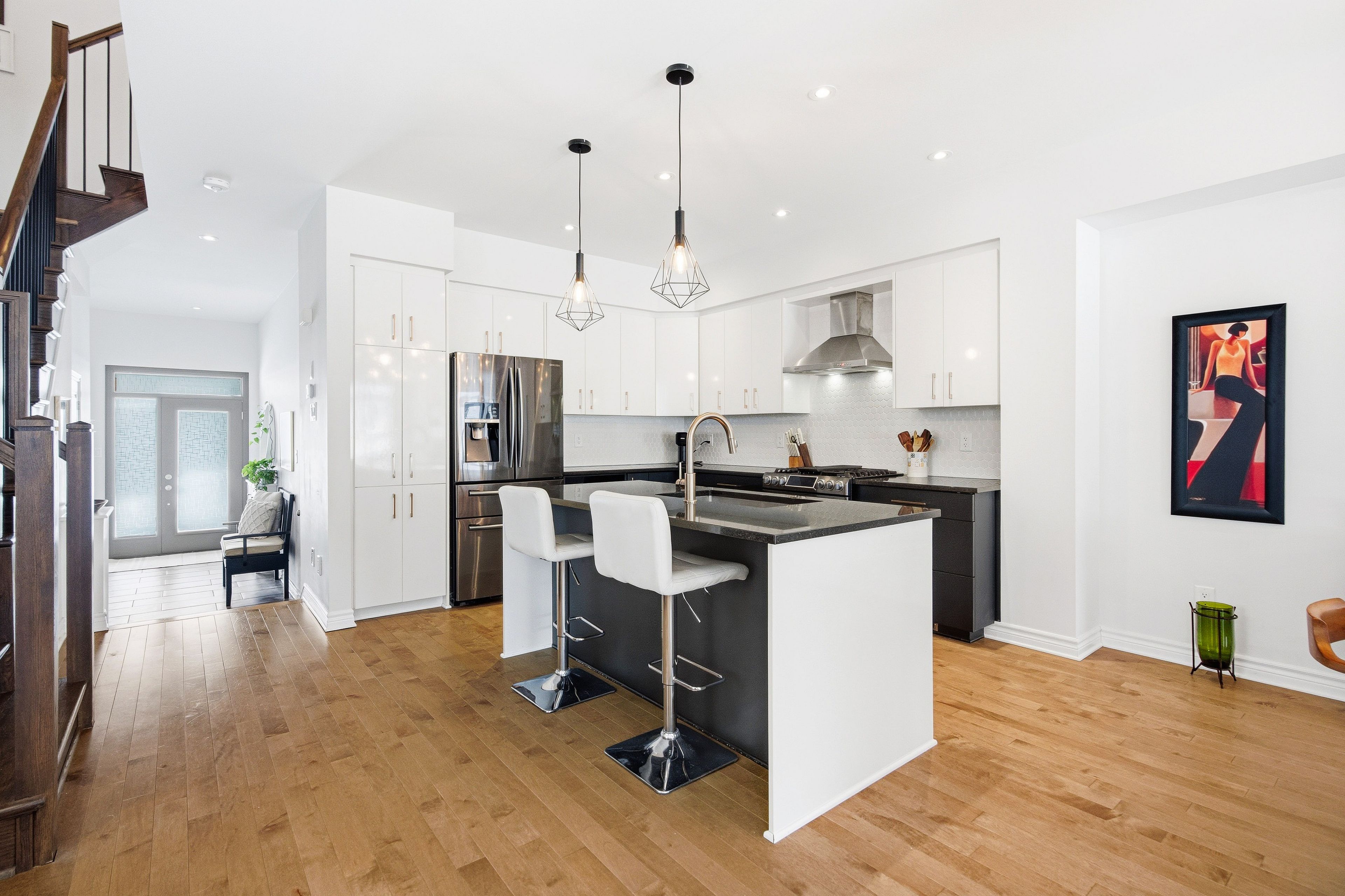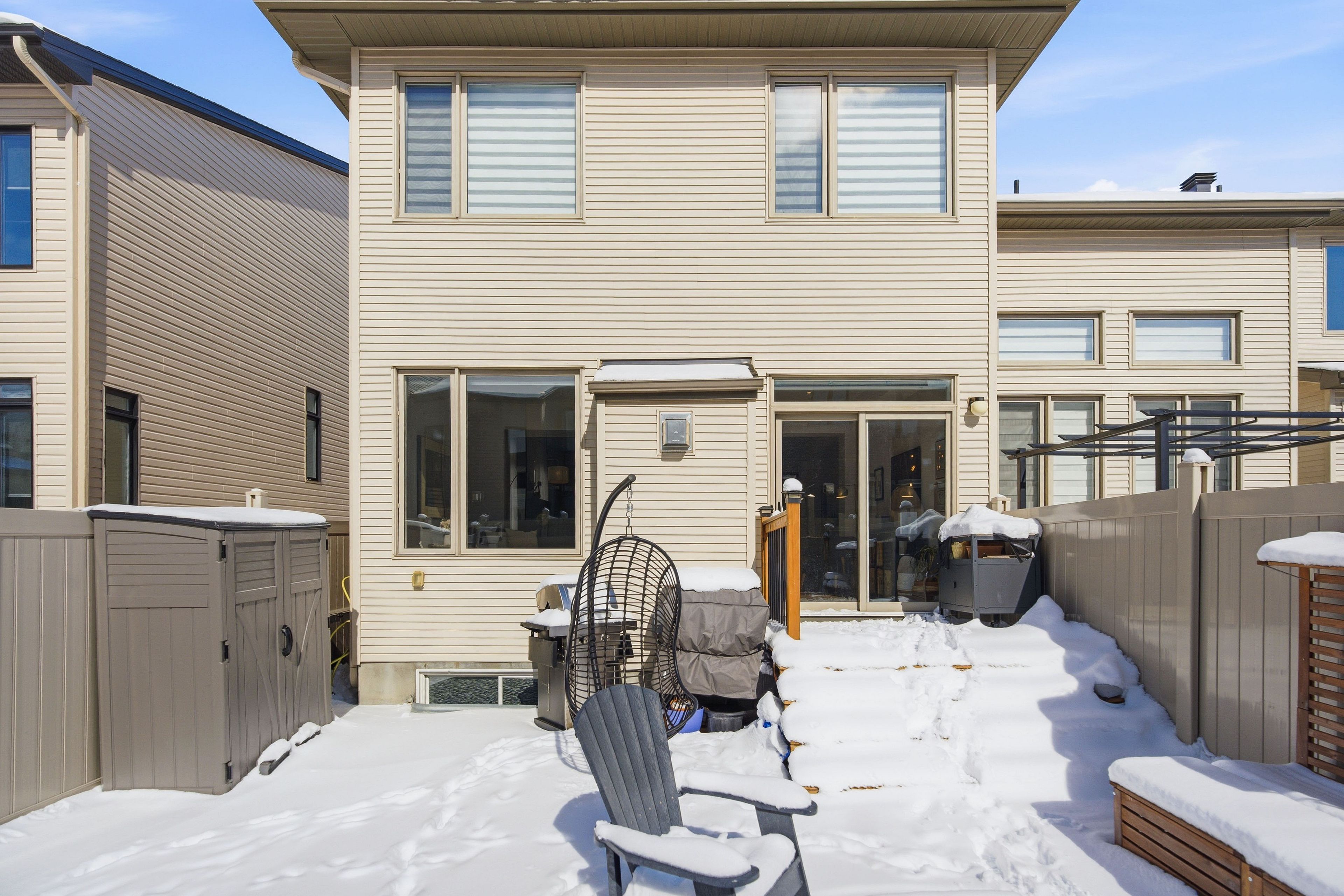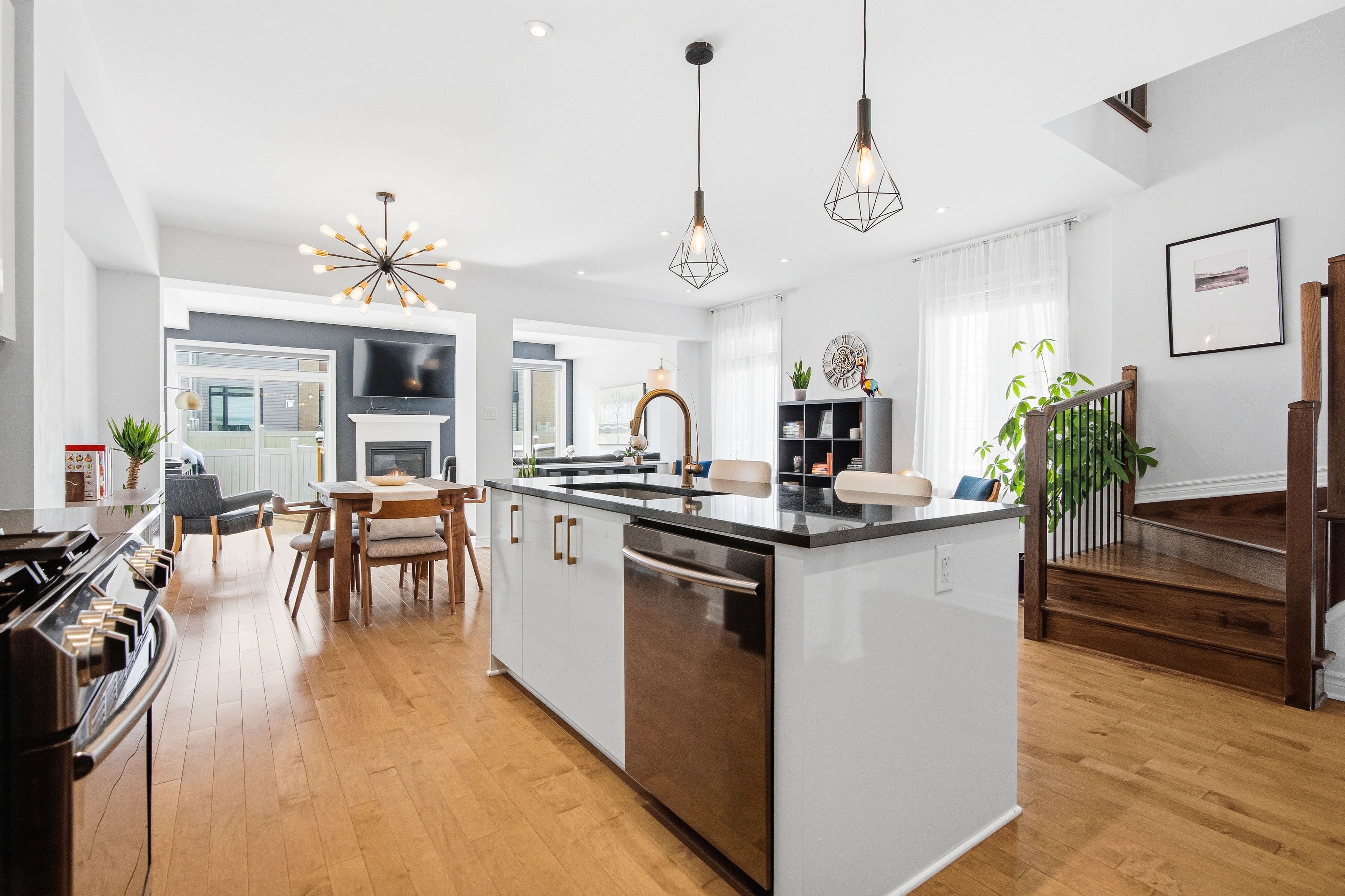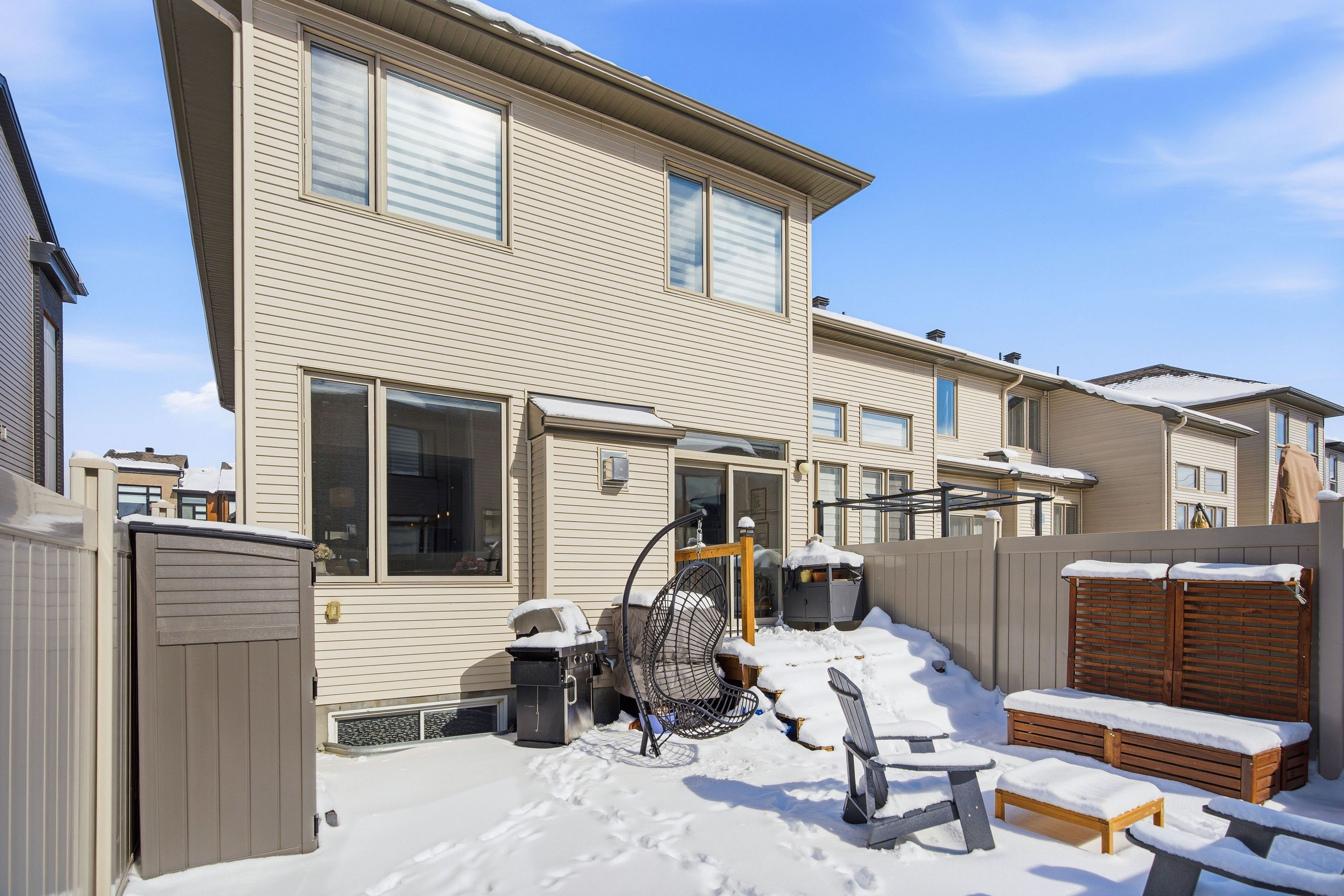 Welcome to Richcraft's largest townhome model, featuring hardwood on both the main and second levels, 3 bedrooms plus den upstairs, and a private driveway with interlock for side by side parking. Step inside from the covered porch into a bright, open concept main floor with high ceilings and large windows that fill the space with natural light. The two-toned kitchen features quartz countertops, black stainless-steel appliances, a gas range, pendant lighting, which flows seamlessly into the dining area and living room where a gas fireplace adds warmth and character. A patio door leads to the fully fenced backyard with widened back steps leading to the interlock patio, designed for easy, low maintenance outdoor living. Upstairs, the spacious primary bedroom includes a walk-in closet and a 4-piece ensuite. Two additional bedrooms, a full bathroom, a versatile den, and second floor laundry completes the level. The finished basement extends your living space with a recreation room and additional storage. Ideally located close to parks, schools, shopping, and transit, this home offers a great balance of space, function, and convenience.