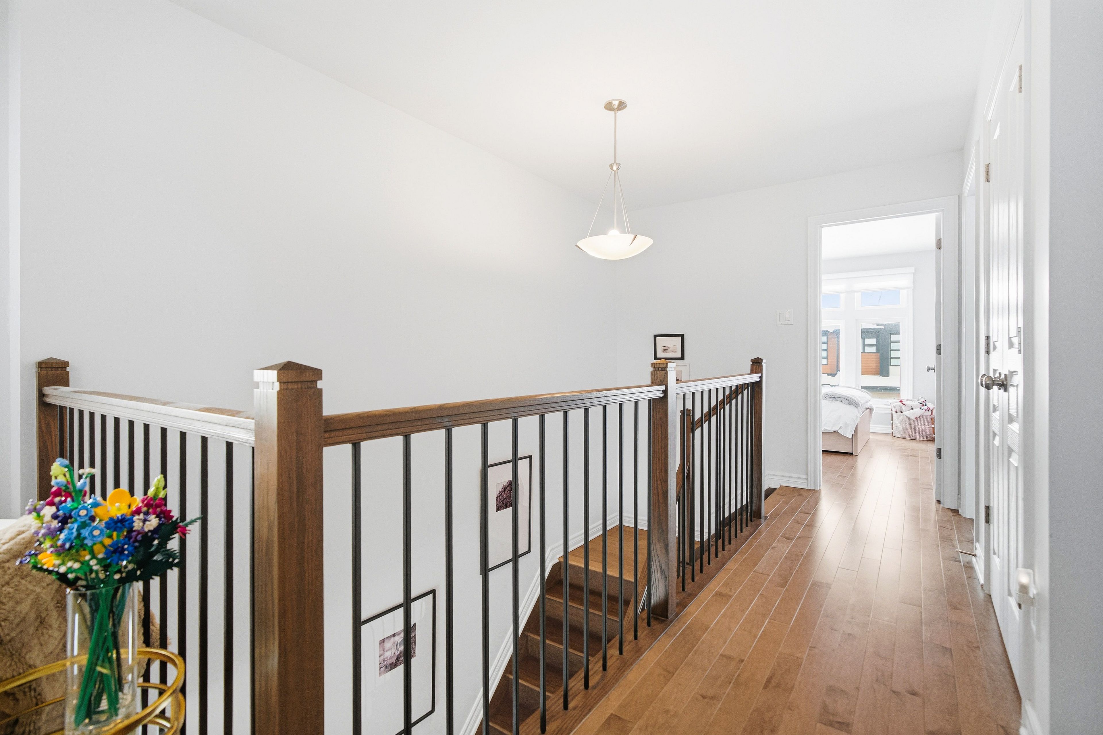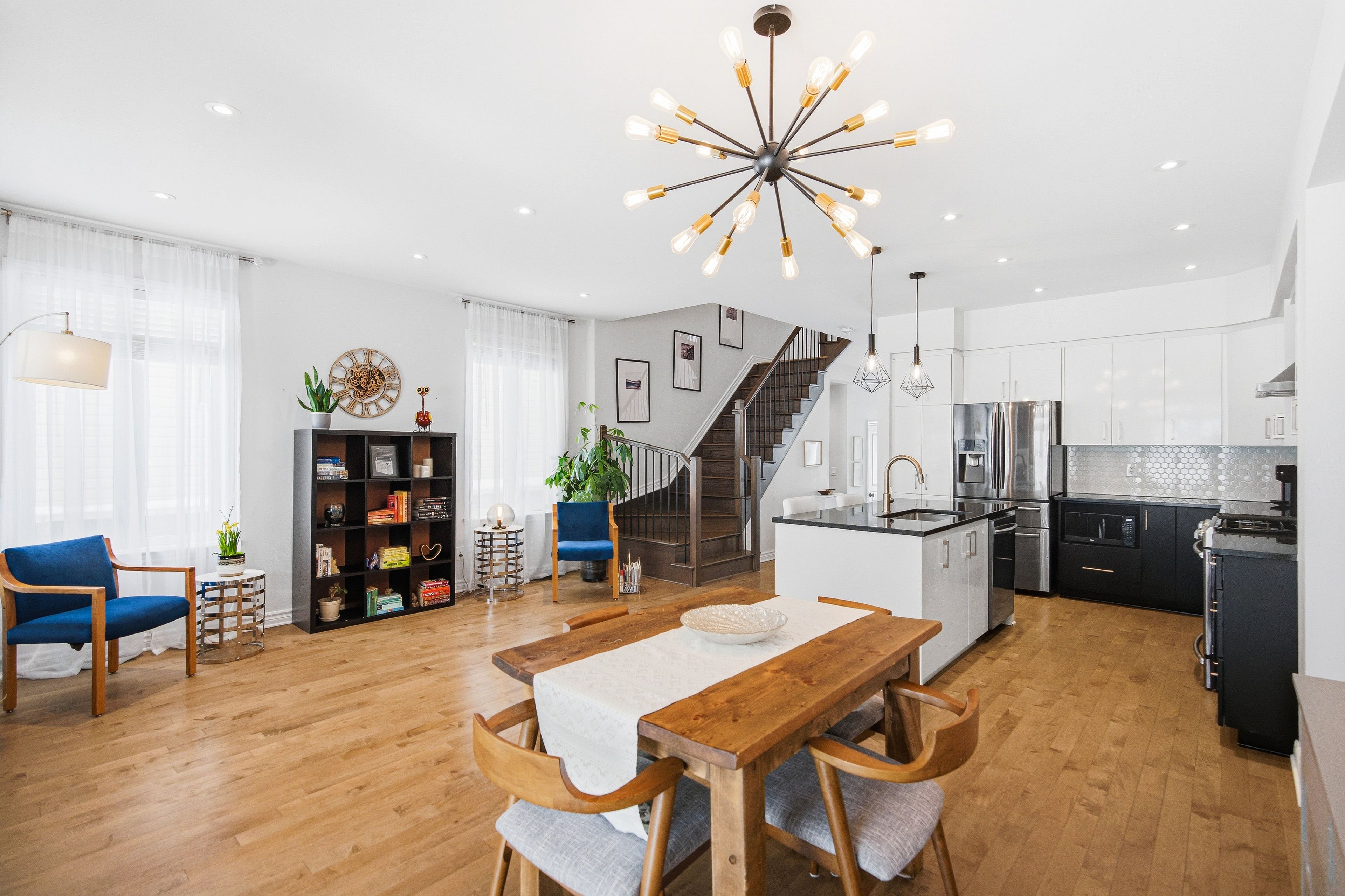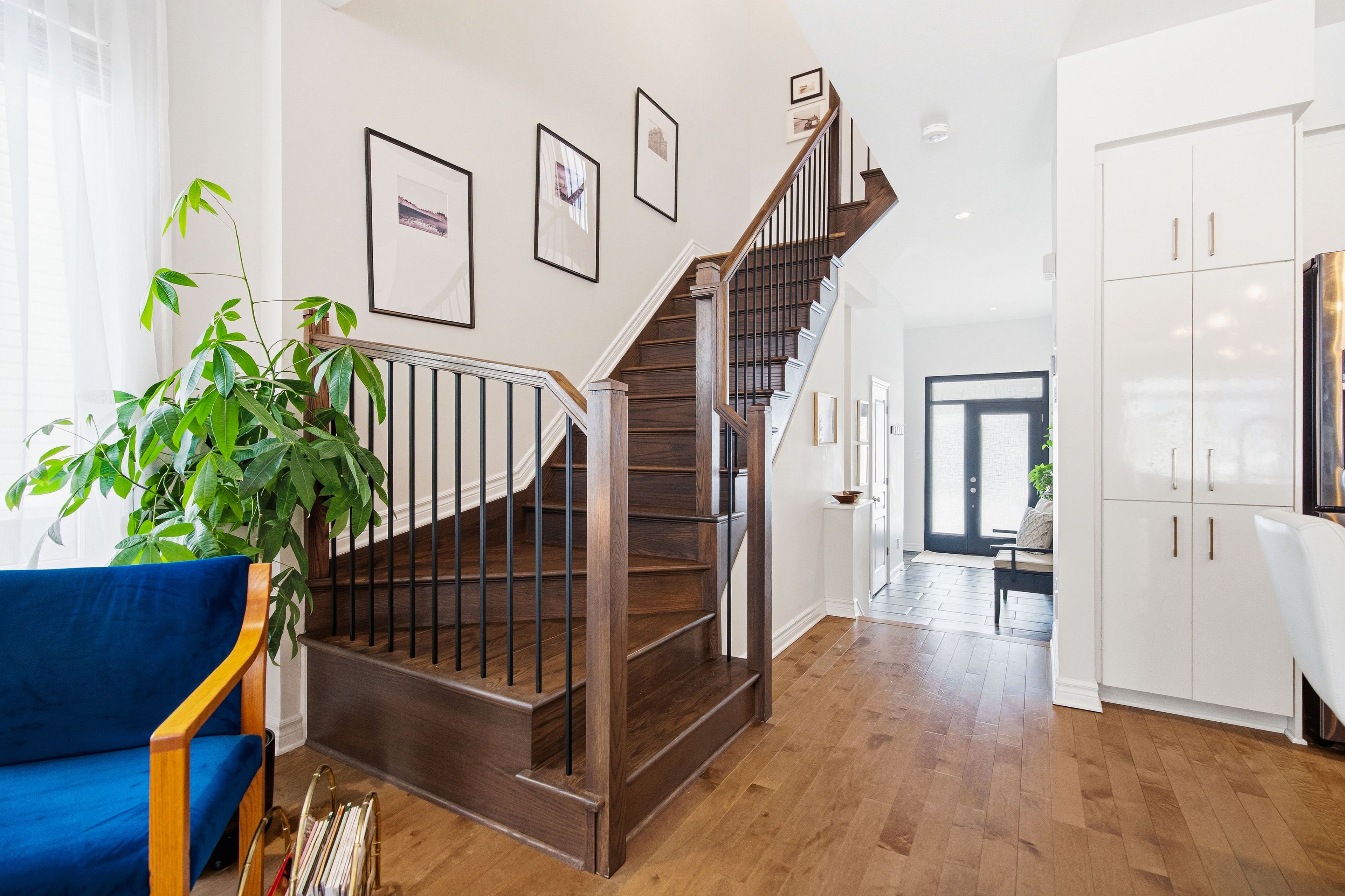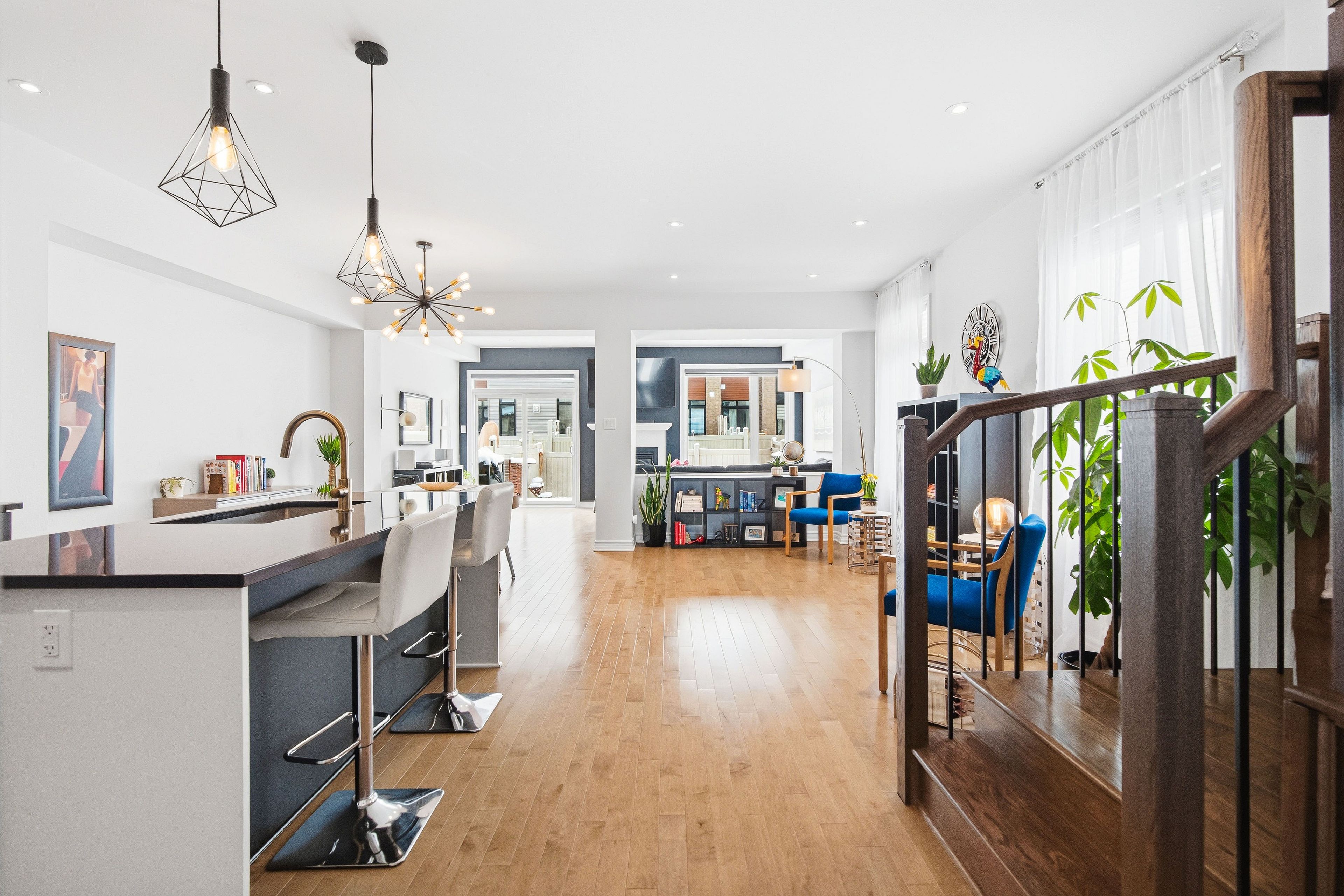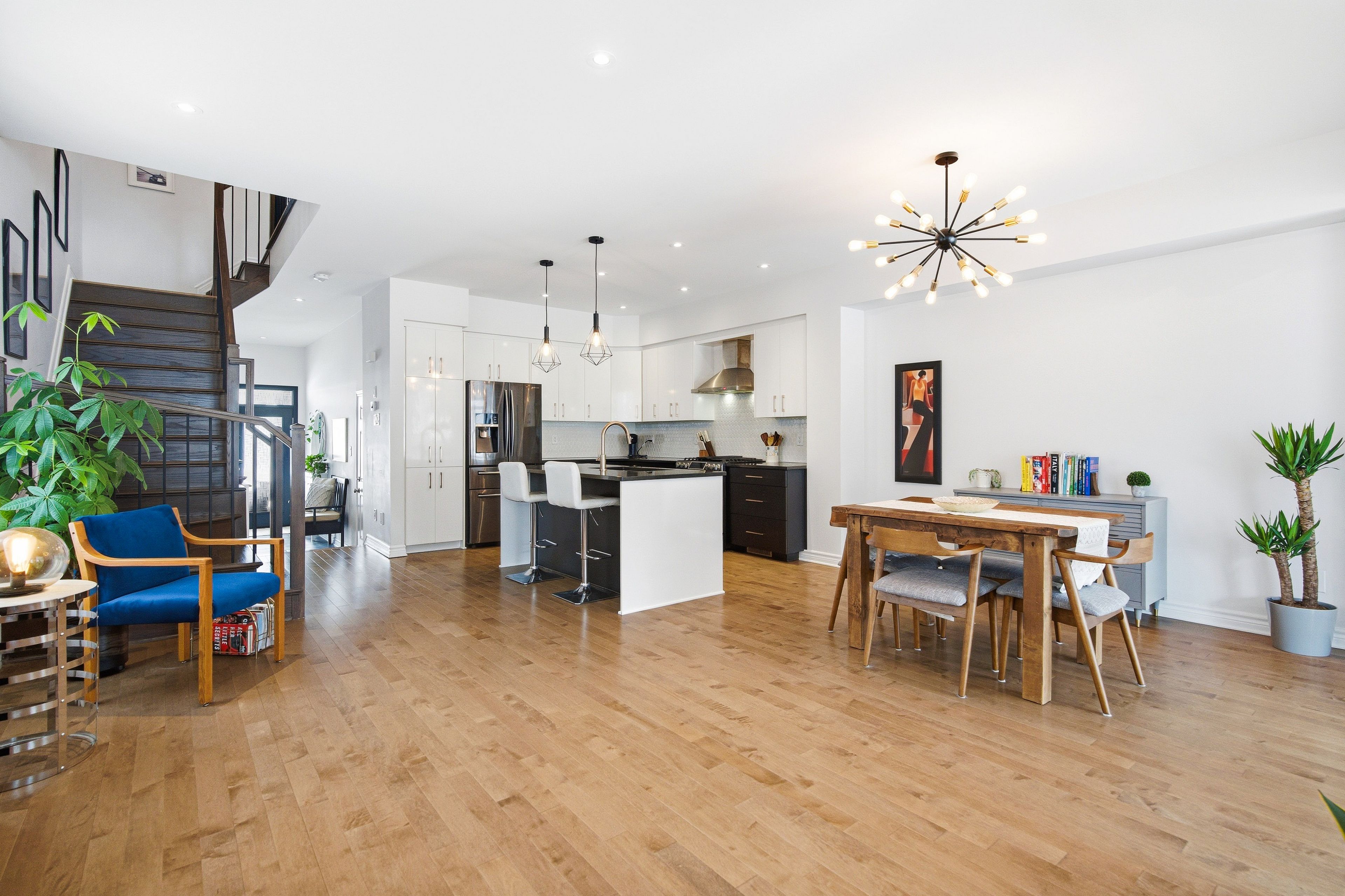 Welcome to Richcraft's largest townhome model, featuring hardwood on both the main and second levels, 3 bedrooms plus den upstairs, and a private driveway with interlock for side by side parking. Step inside from the covered porch into a bright, open concept main floor with high ceilings and large windows that fill the space with natural light. The two-toned kitchen features quartz countertops, black stainless-steel appliances, a gas range, pendant lighting, which flows seamlessly into the dining area and living room where a gas fireplace adds warmth and character. A patio door leads to the fully fenced backyard with widened back steps leading to the interlock patio, designed for easy, low maintenance outdoor living. Upstairs, the spacious primary bedroom includes a walk-in closet and a 4-piece ensuite. Two additional bedrooms, a full bathroom, a versatile den, and second floor laundry completes the level. The finished basement extends your living space with a recreation room and additional storage. Ideally located close to parks, schools, shopping, and transit, this home offers a great balance of space, function, and convenience.