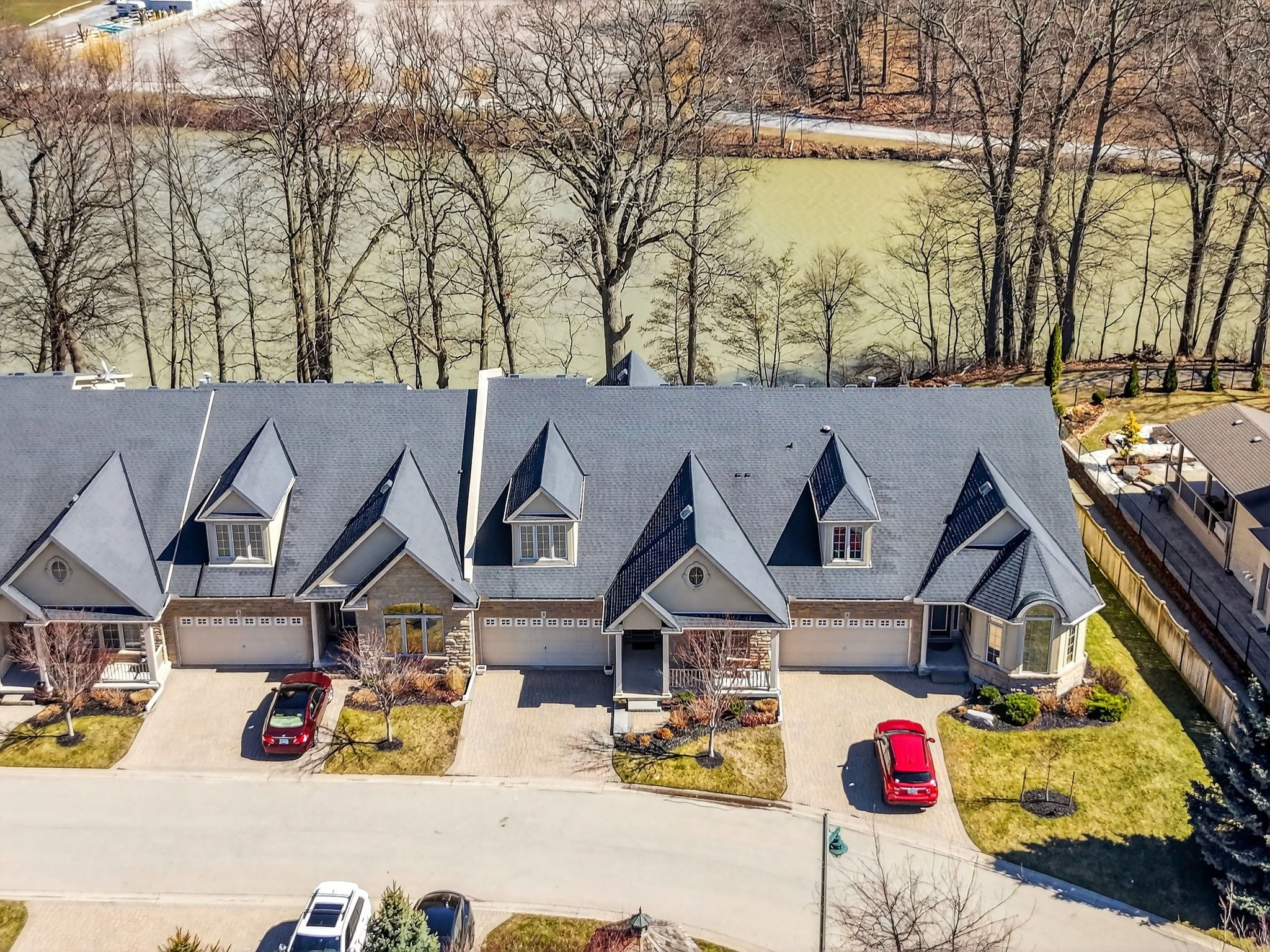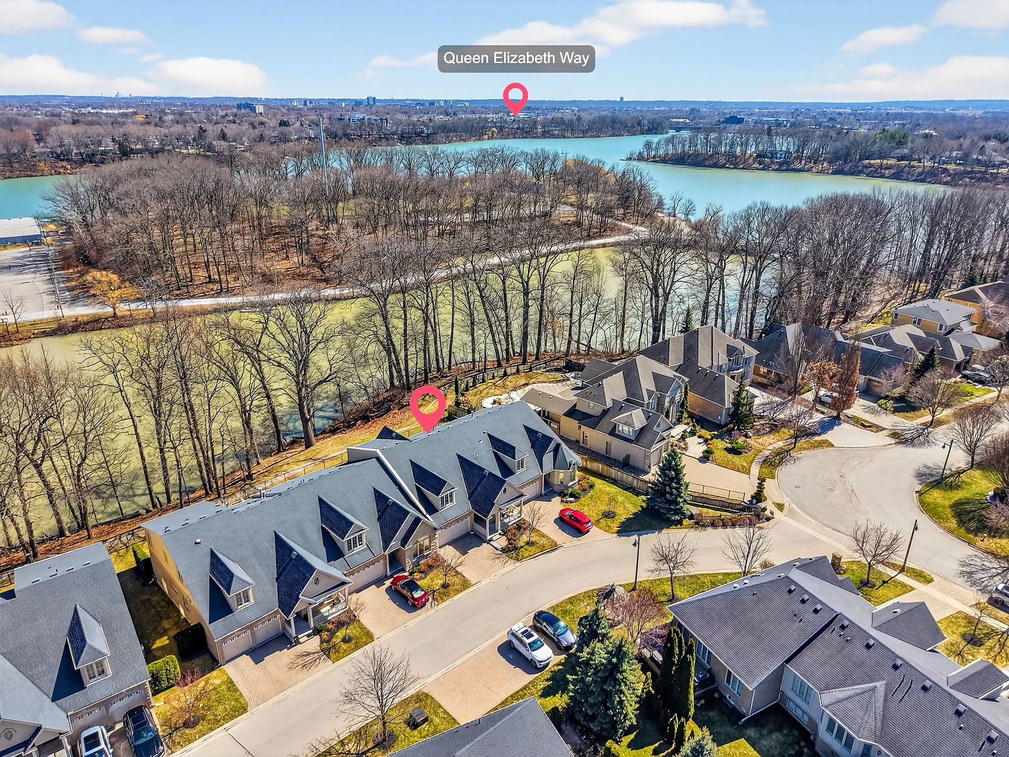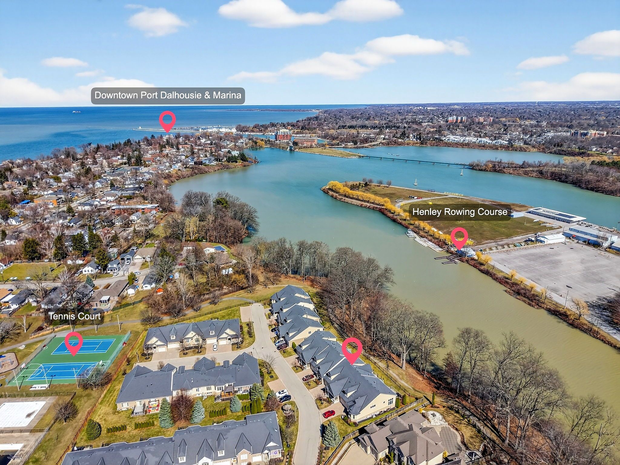 Welcome to Victory Walk in Port Dalhousie, St, Catharines - Part of an exclusive collection of luxury waterfront bungaloft townhomes, backing directly onto the Martindale Pond waterway with direct access to Lake Ontario. This executive condominium residence offers approximately 3,000+ sq.ft. of fully customized living space, thoughtfully designed for both comfort and entertaining. From the front, enjoy a beautifully landscaped yard, inviting sit-out porch, interlock driveway, double car garage and convenient guest parking. Inside, the main level in a grand entrance with impressive 18' vaulted ceilings, Brazilian Cherrywood hardwood flooring throughout and wall-to-wall windows that frame tranquil, tree-lined water views. A seamless open-concept layout connects the living, dining, and kitchen areas-featuring granite countertops, ample cabinetry, a vast central island, additional beverage fridge, skylight, and a cozy gas fireplace. A double door walk-out lead to a spacious deck with remote awnings, overlooking the waterway, Henley Island, and nearby rowing clubs. The upper-level primary bedroom is a private retreat, complete with a full walk-in closet and 3-piece ensuite. The fully finished basement expands your living options with an additional bedroom, 4-piece bath with a connecting 2-piece spa inspired room complete with bubbler tub, electric fireplace and back-lit walls. A custom bar and bonus workshop/craft room complete the space as well as a separate basement walk-out which creates an ideal potential for an in-law or multi-generational suite to explore. Experience refined waterfront living with access to local amenities, water recreation, community pool/tennis steps away, Marina's, East and West Piers, the village downtown, the "waterfront trail" out your back door, parks, minutes to wine country, 20 mins to Niagara Falls/Attractions and Casinos, Premium golf, highway access and the unmatched charm of this sought-after lakeside community.