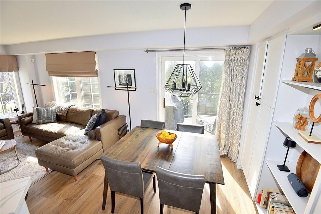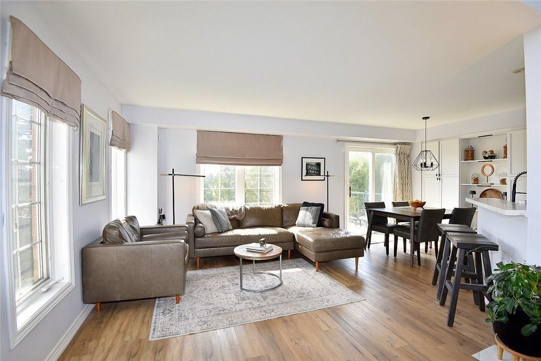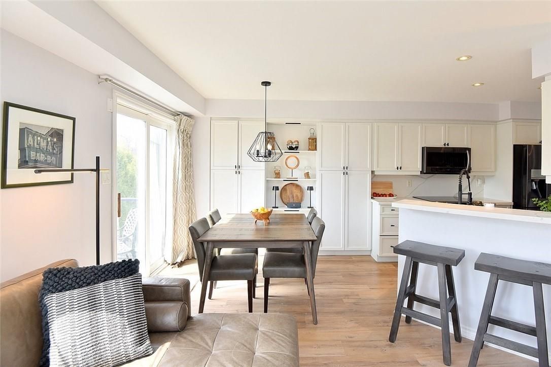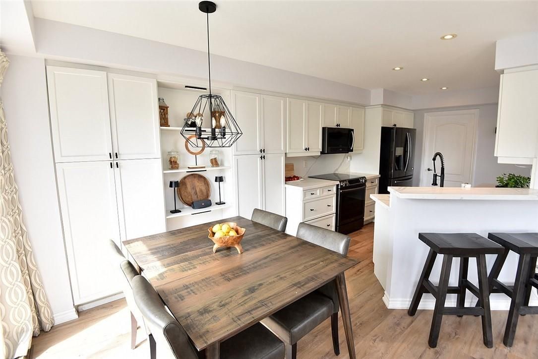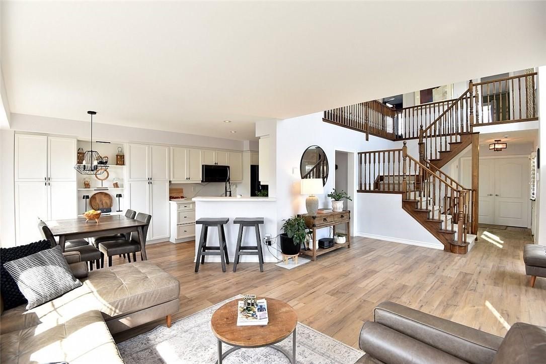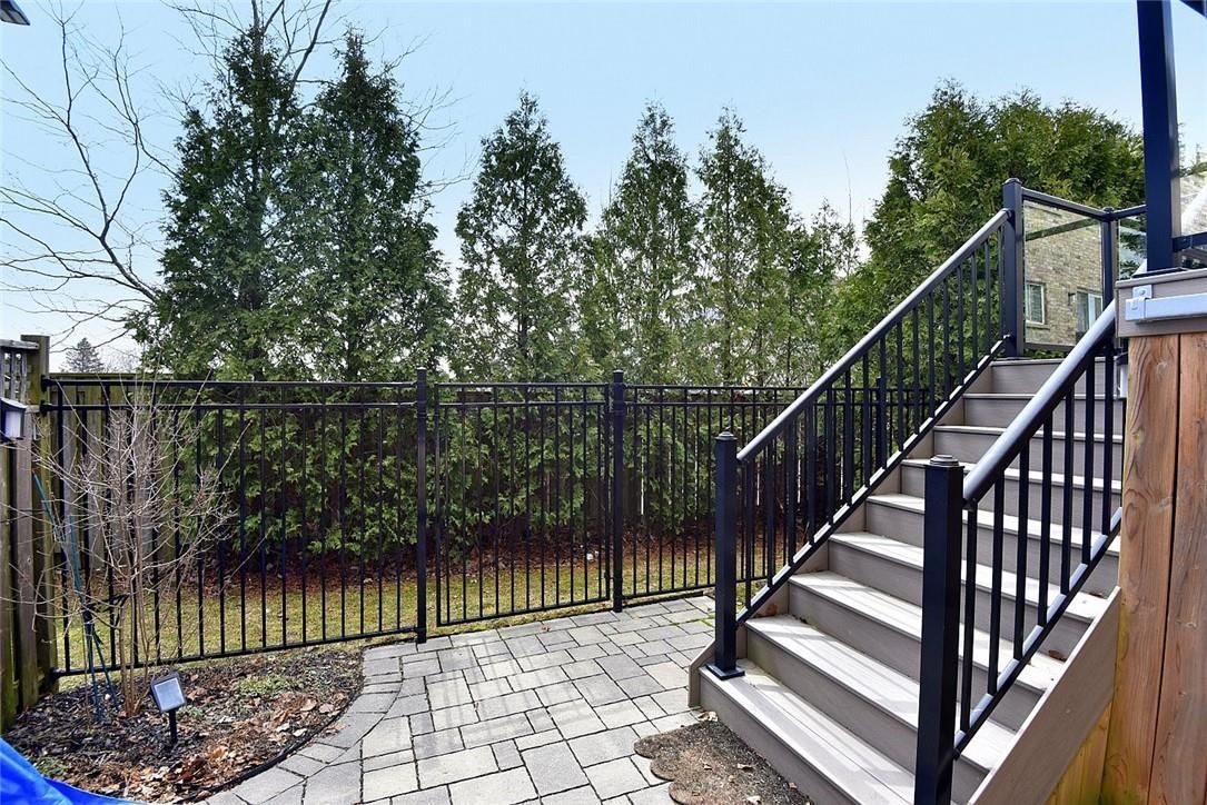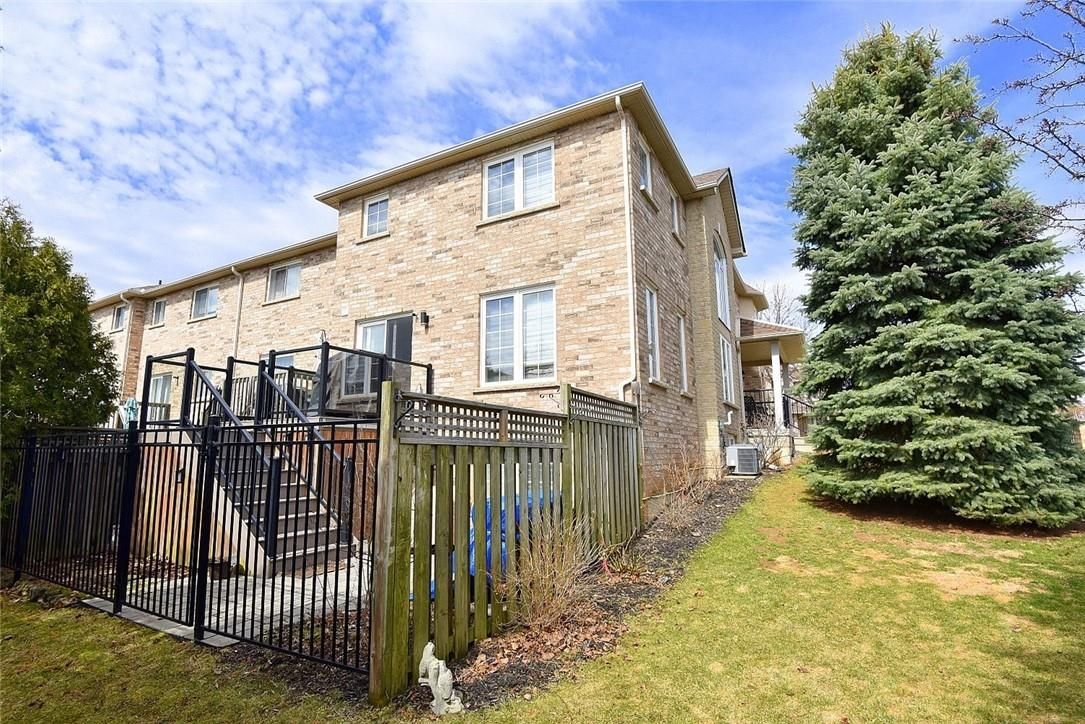 Welcome to this beautifully maintained end-unit townhome in the heart of Ancaster, offering exceptional curb appeal and an impressive amount of living space. With approximately 2,452 sq ft of finished living space (1860 sqft above grade + 592 sqft below), this home is ideal for families seeking both comfort and functionality. The main level features a grand double-door entry, elegant Palladian-style windows in the dining area, a main floor office/den, and spacious principal rooms. The updated kitchen offers granite countertops, a breakfast bar, built-in pantry cabinetry, and a bright dinette area, with convenient access to the backyard. A main floor laundry room, updated 2-piece powder room, and custom window treatments complete this level. Upstairs, the generous primary suite includes a beautifully updated ensuite, complemented by two additional bedrooms and a recently renovated 4-piece family bathroom with quality finishes. Newer broadloom adds warmth throughout the second level. The finished lower level provides additional living space with a family room featuring built-in shelving/entertainment unit, a home office area, gym space, and a 2-piece bathroom. Enjoy a fully landscaped, fenced backyard with a composite deck, stone patio, and gated access-perfect for outdoor living and entertaining. Ideally located close to downtown Ancaster, parks, schools including Bishop Tonnos, highway access, and everyday amenities.