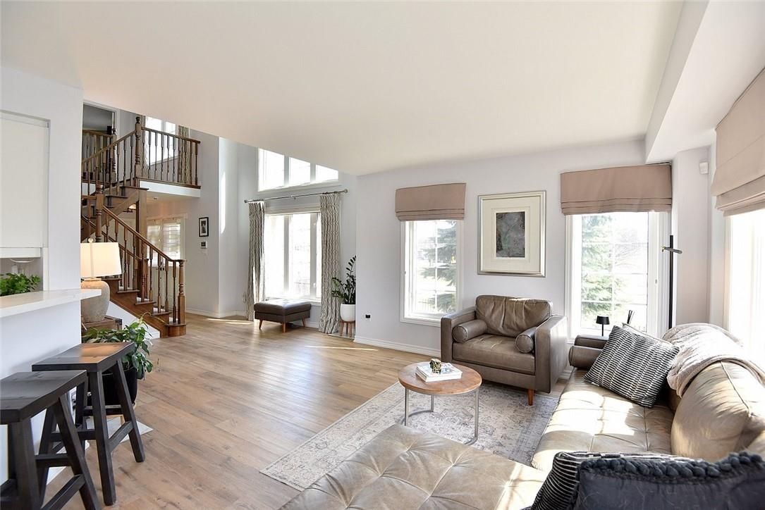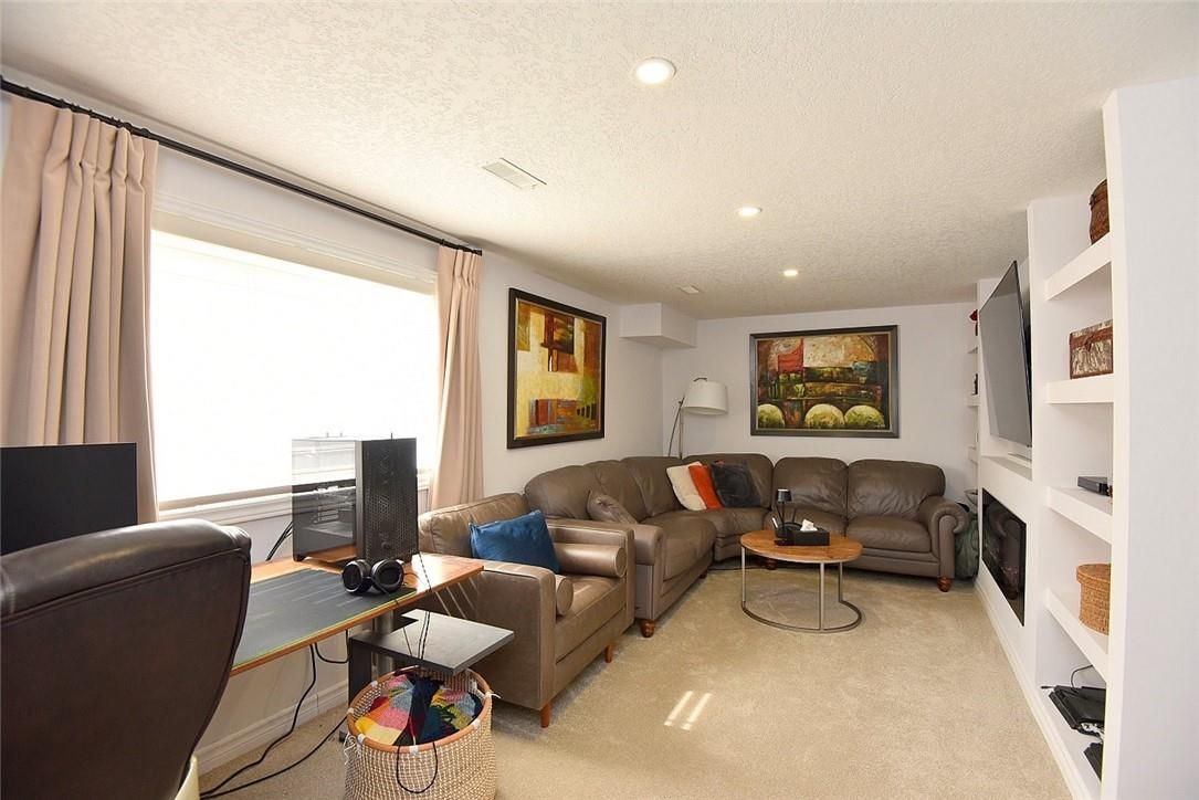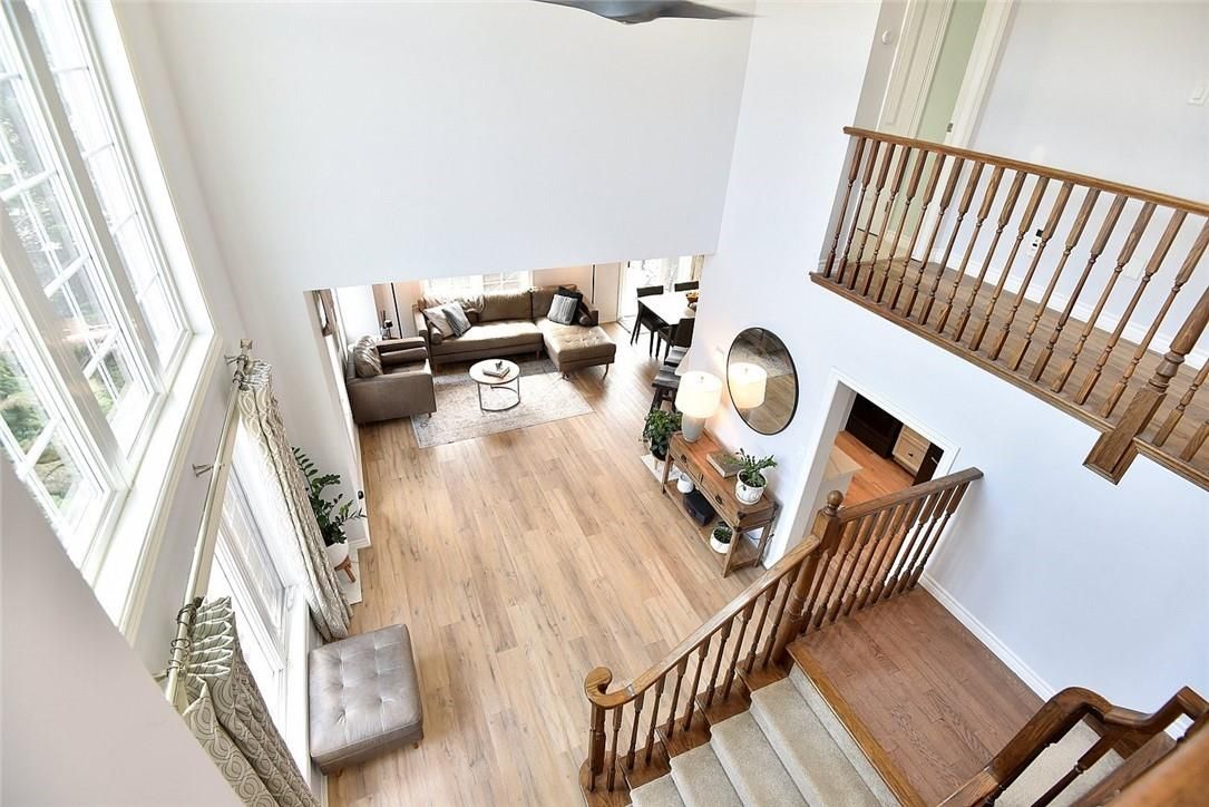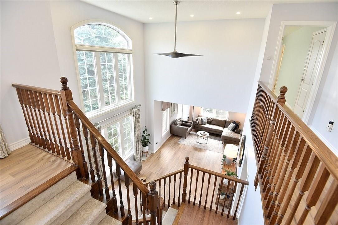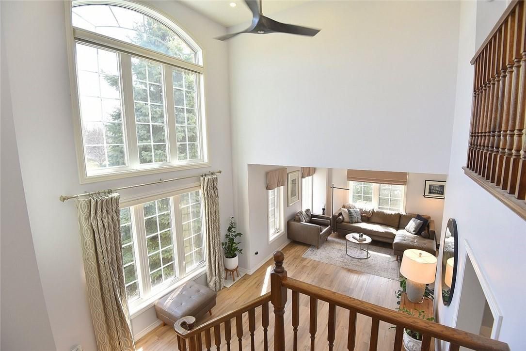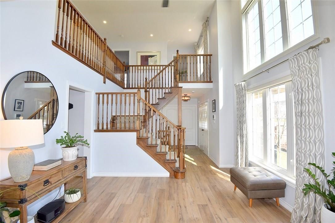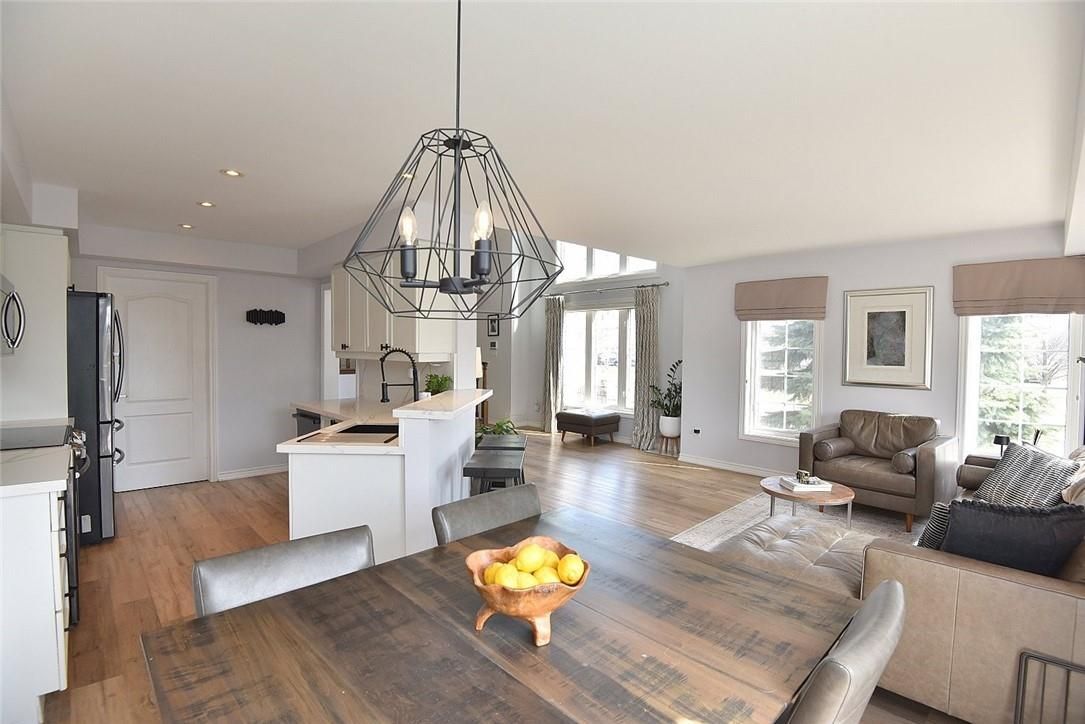 Welcome to this beautifully maintained end-unit townhome in the heart of Ancaster, offering exceptional curb appeal and an impressive amount of living space. With approximately 2,452 sq ft of finished living space (1860 sqft above grade + 592 sqft below), this home is ideal for families seeking both comfort and functionality. The main level features a grand double-door entry, elegant Palladian-style windows in the dining area, a main floor office/den, and spacious principal rooms. The updated kitchen offers granite countertops, a breakfast bar, built-in pantry cabinetry, and a bright dinette area, with convenient access to the backyard. A main floor laundry room, updated 2-piece powder room, and custom window treatments complete this level. Upstairs, the generous primary suite includes a beautifully updated ensuite, complemented by two additional bedrooms and a recently renovated 4-piece family bathroom with quality finishes. Newer broadloom adds warmth throughout the second level. The finished lower level provides additional living space with a family room featuring built-in shelving/entertainment unit, a home office area, gym space, and a 2-piece bathroom. Enjoy a fully landscaped, fenced backyard with a composite deck, stone patio, and gated access-perfect for outdoor living and entertaining. Ideally located close to downtown Ancaster, parks, schools including Bishop Tonnos, highway access, and everyday amenities.