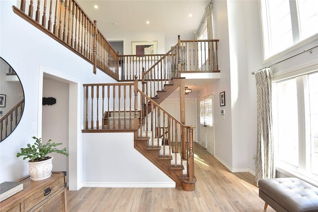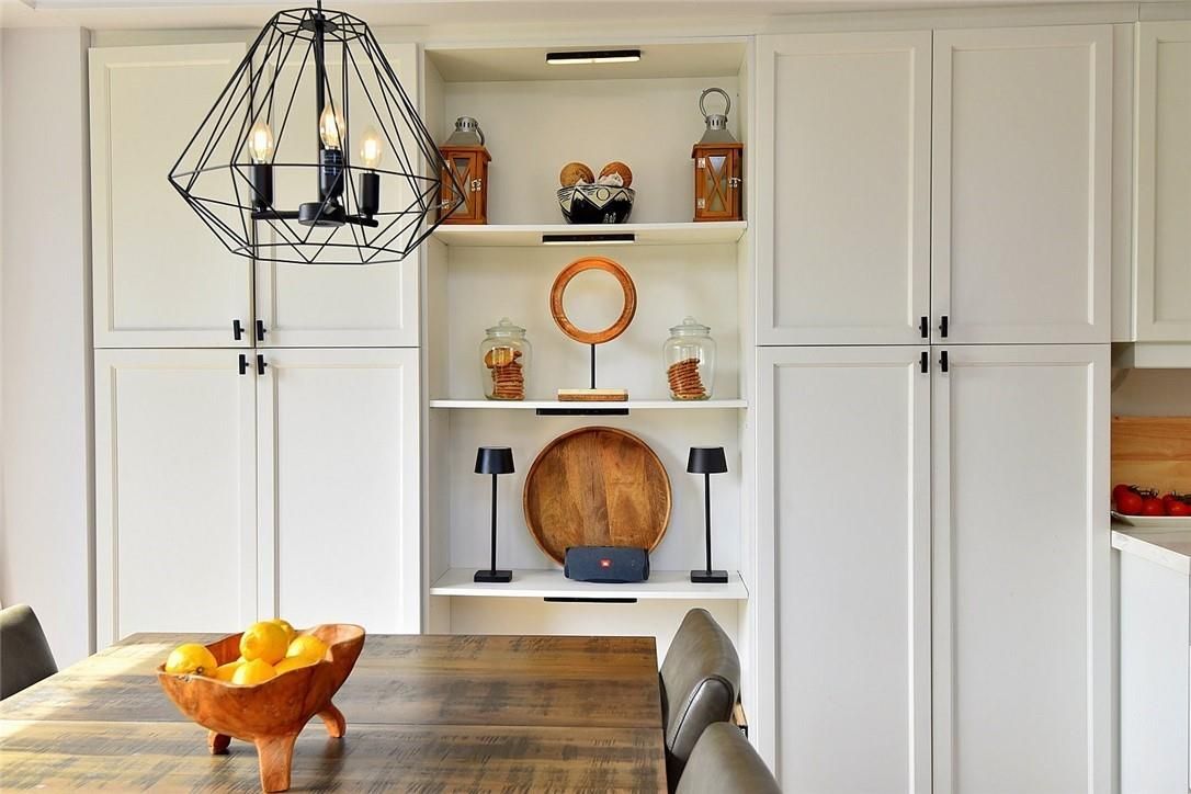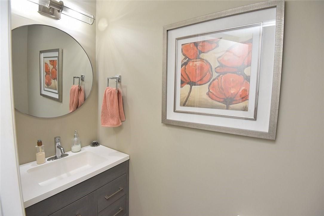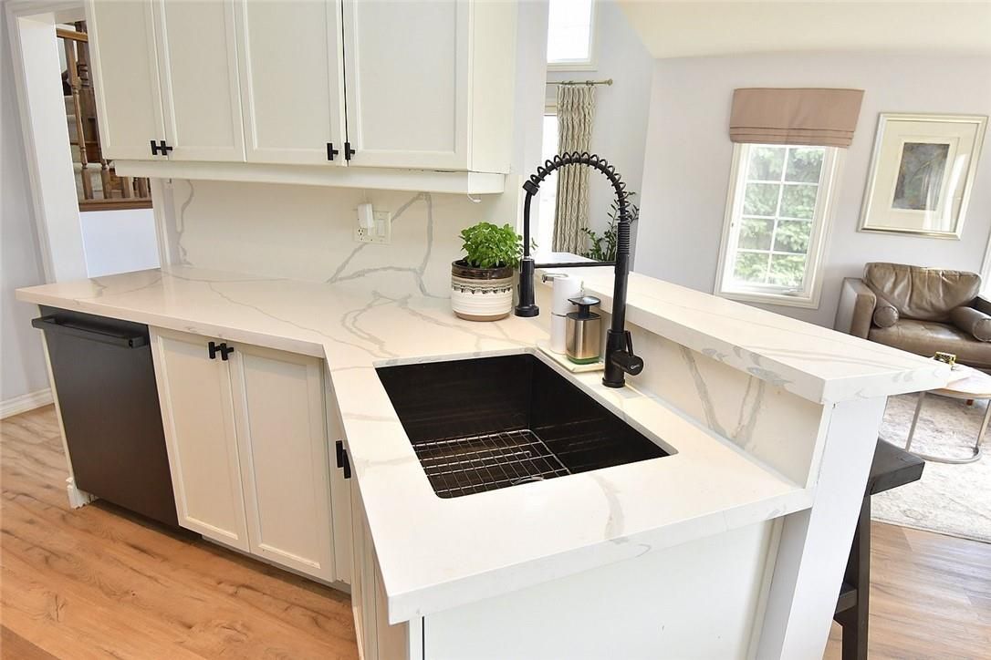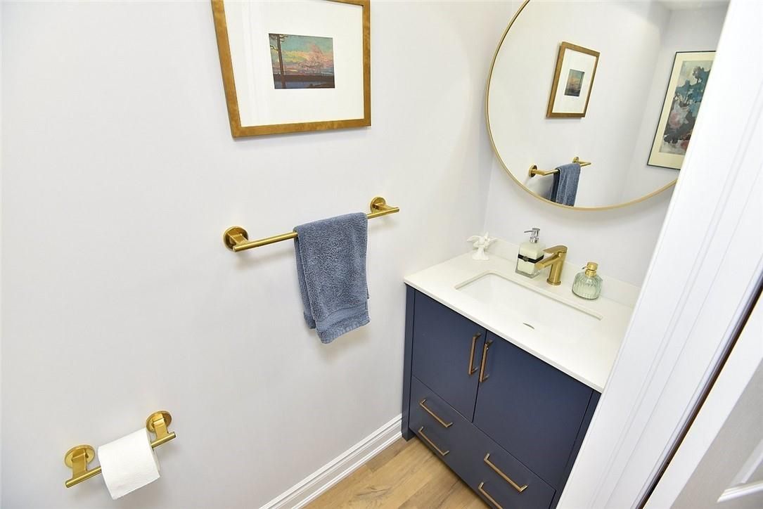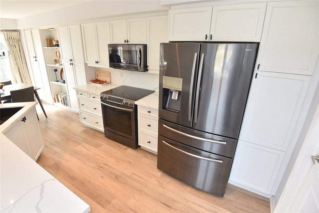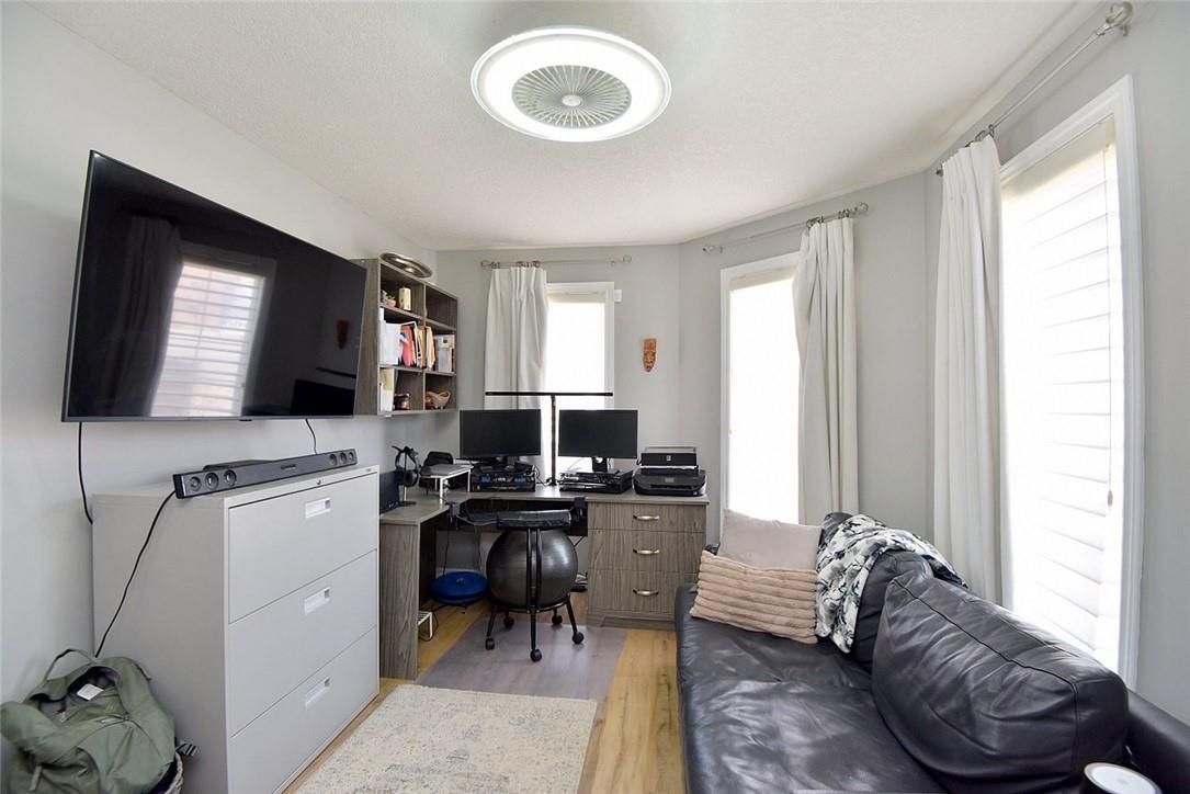 Welcome to this beautifully maintained end-unit townhome in the heart of Ancaster, offering exceptional curb appeal and an impressive amount of living space. With approximately 2,452 sq ft of finished living space (1860 sqft above grade + 592 sqft below), this home is ideal for families seeking both comfort and functionality. The main level features a grand double-door entry, elegant Palladian-style windows in the dining area, a main floor office/den, and spacious principal rooms. The updated kitchen offers granite countertops, a breakfast bar, built-in pantry cabinetry, and a bright dinette area, with convenient access to the backyard. A main floor laundry room, updated 2-piece powder room, and custom window treatments complete this level. Upstairs, the generous primary suite includes a beautifully updated ensuite, complemented by two additional bedrooms and a recently renovated 4-piece family bathroom with quality finishes. Newer broadloom adds warmth throughout the second level. The finished lower level provides additional living space with a family room featuring built-in shelving/entertainment unit, a home office area, gym space, and a 2-piece bathroom. Enjoy a fully landscaped, fenced backyard with a composite deck, stone patio, and gated access-perfect for outdoor living and entertaining. Ideally located close to downtown Ancaster, parks, schools including Bishop Tonnos, highway access, and everyday amenities.